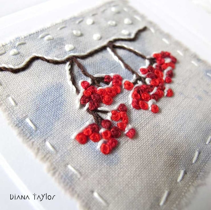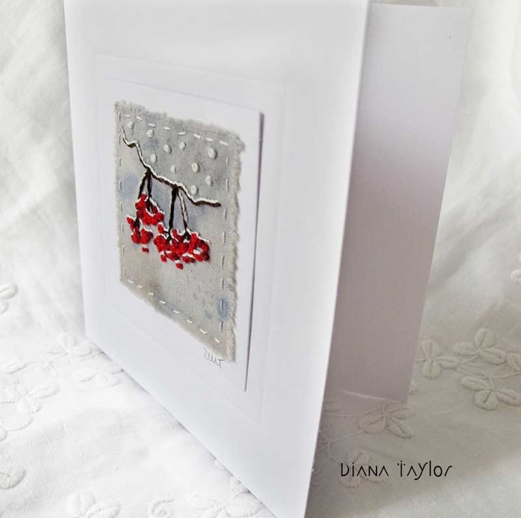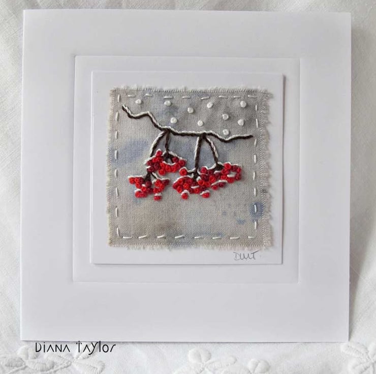 This beautiful card has been embroidered by hand onto fabric that I have dyed in shades of beige with touches of pale blue. The design is of a branch of bright red winter berries with white snowy highlights - perfect for a special Christmas or winter birthday card, or perhaps framing it as it is. It has been mounted on a card base and is surrounded by an embossed square. The card has been left blank for your own message.