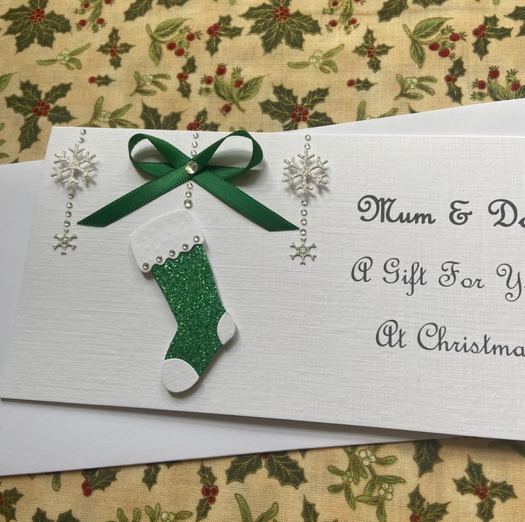This handmade personalised Christmas gift voucher/money wallet is 210mm x 100mm and is on 300gsm heavyweight linen card. This can be personalised with a name and greeting of your choice. The card comes with a matching white envelope.