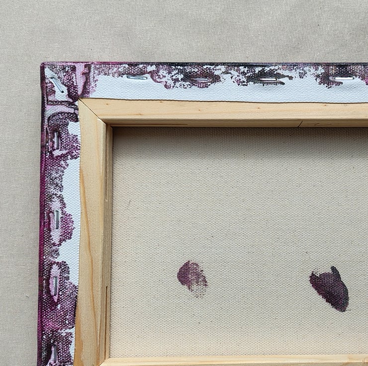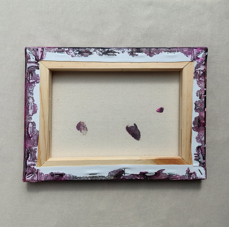 Acrylic Pour Canvas, with a white, gold, black and magenta colour scheme, This canvas has been varnished with gloss varnish, will contain wedges for keeping canvas taut. The canvas size is W25cm x H 20cm x D 1.9cm