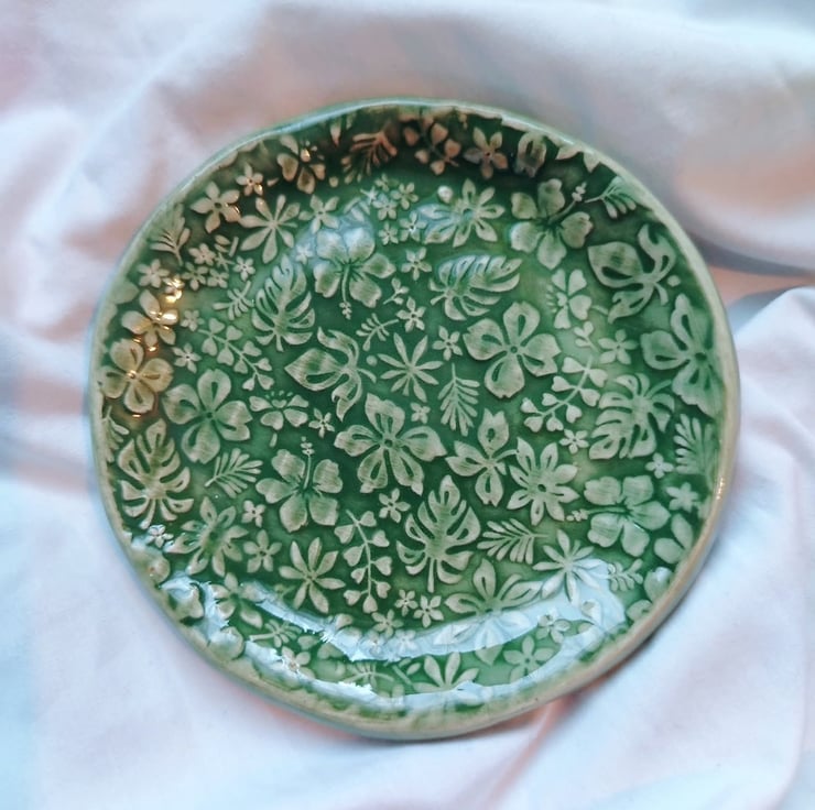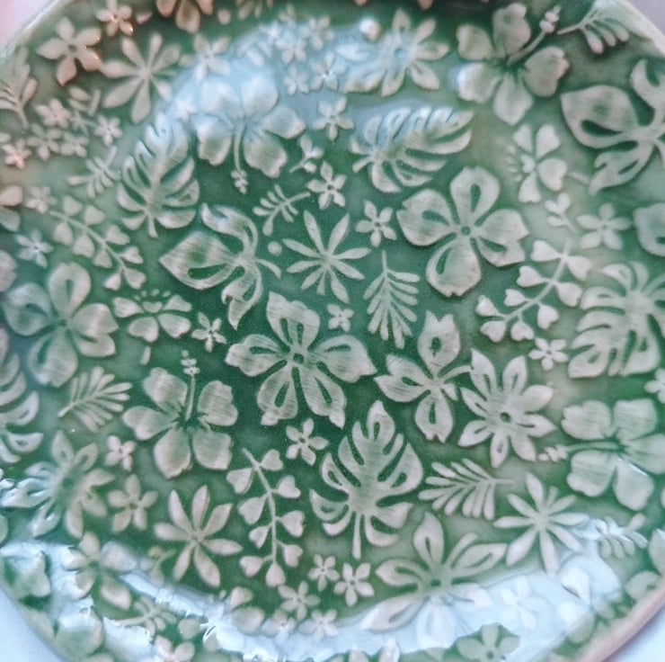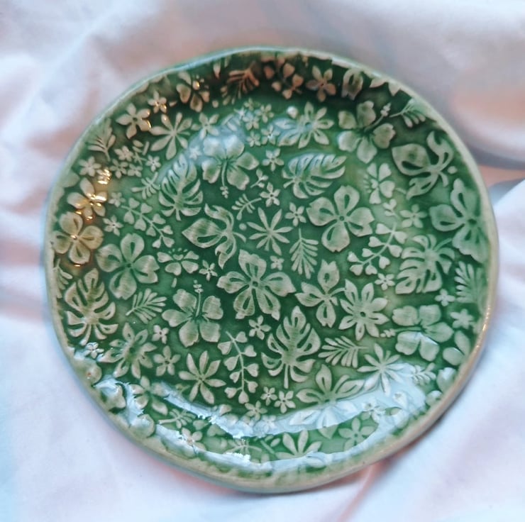 This trinket dish is handbuilt. Rolled with a gorgeous leaf texture.