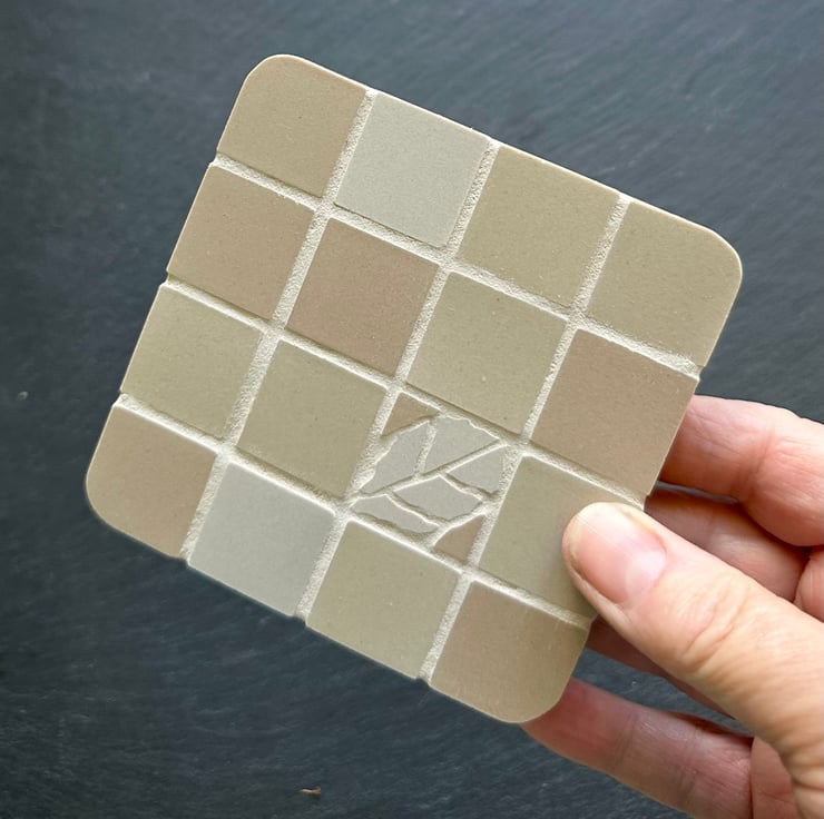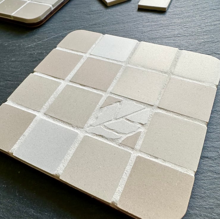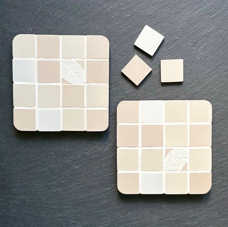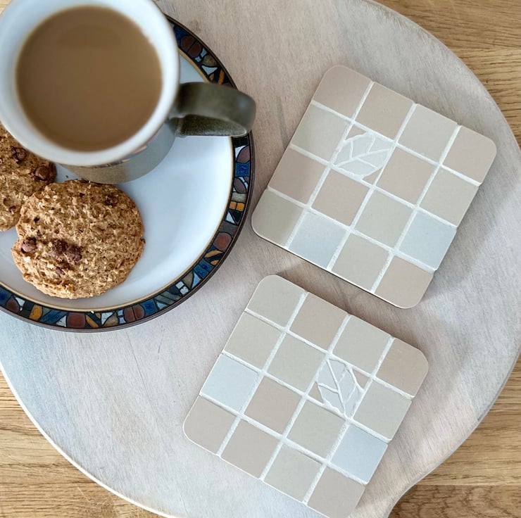 Two, rustic style, mosaic coasters in a random chequerboard design with a single, hand cut leaf motif. Created in neutral shades of unglazed Cinca tiles, these coasters are grouted in cream, for a subtle cottage feel.