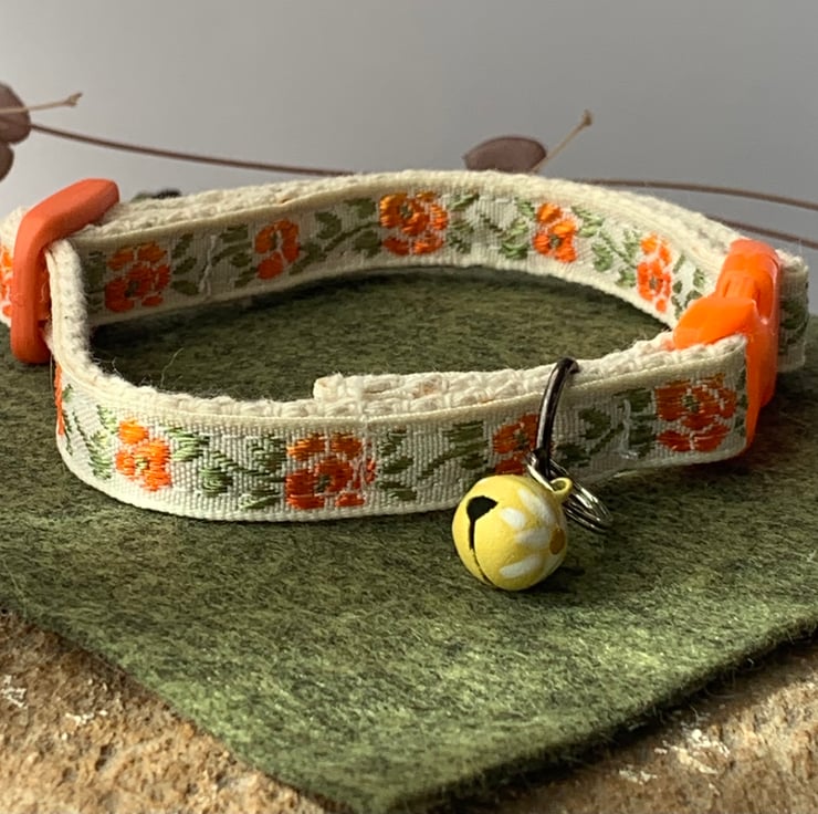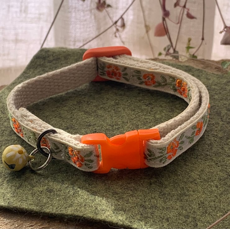 This is an adjustable, break away cat collar for a cat that is thinking of accessorising this season with orange tiny flowers. If your cat wants to go for a fresh and casual look this is the very collar.