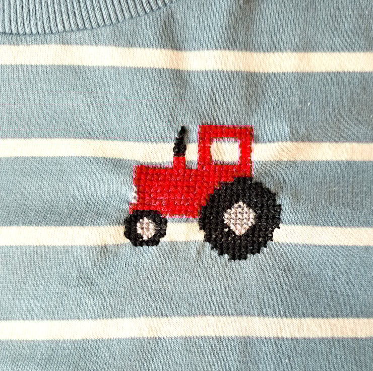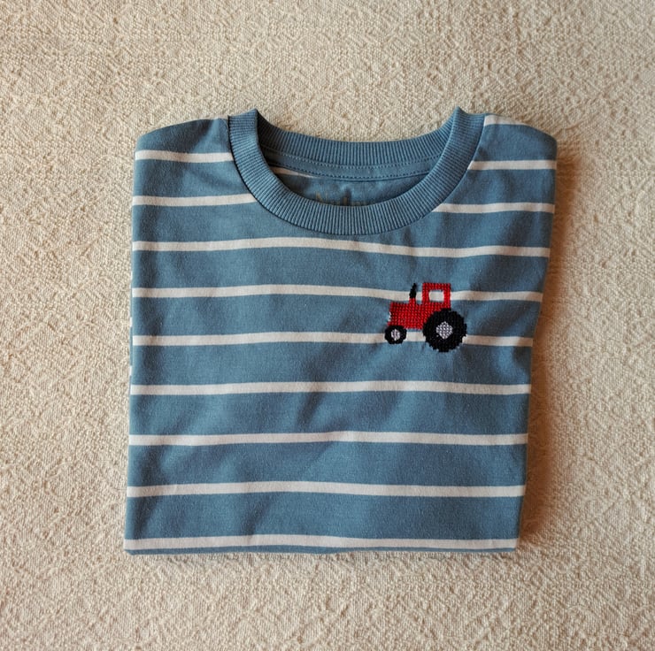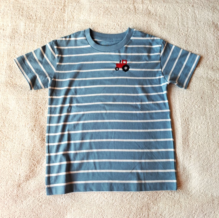 I have hand embroidered a red tractor on the left front of this mid-grey and white striped T-shirt. As I never use a permanent backing material when hand embroidering kids' clothing, there is nothing inside to irritate your child's skin. The shirt has a round neck and short sleeves. It is all cotton and can be machine washed.