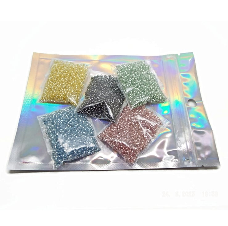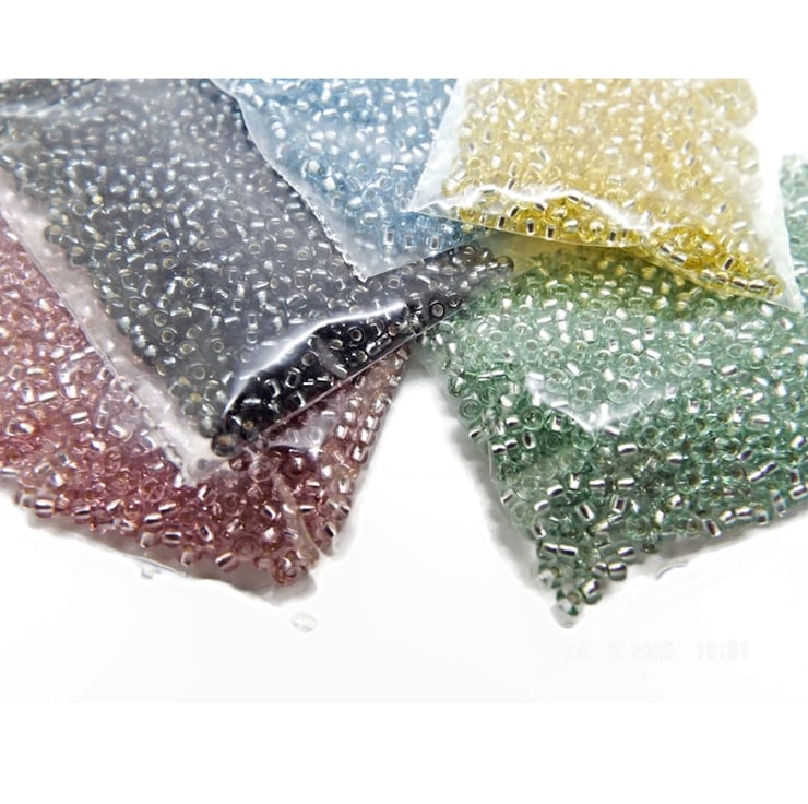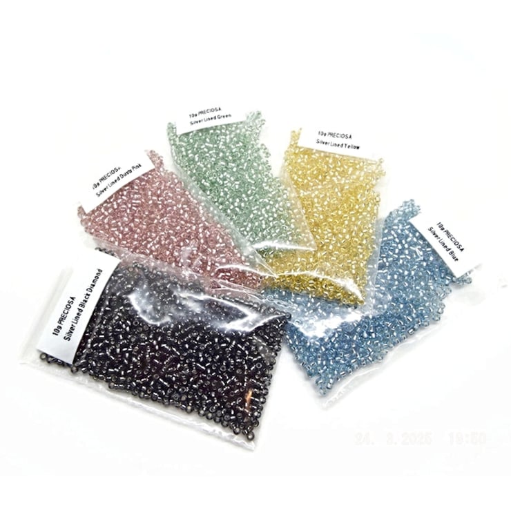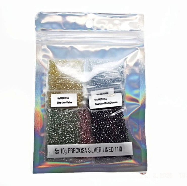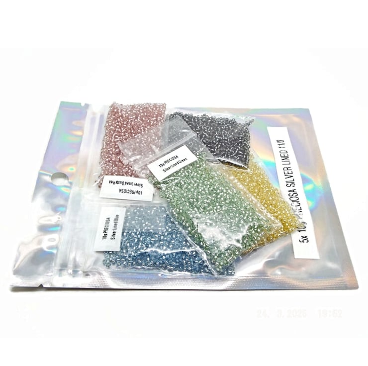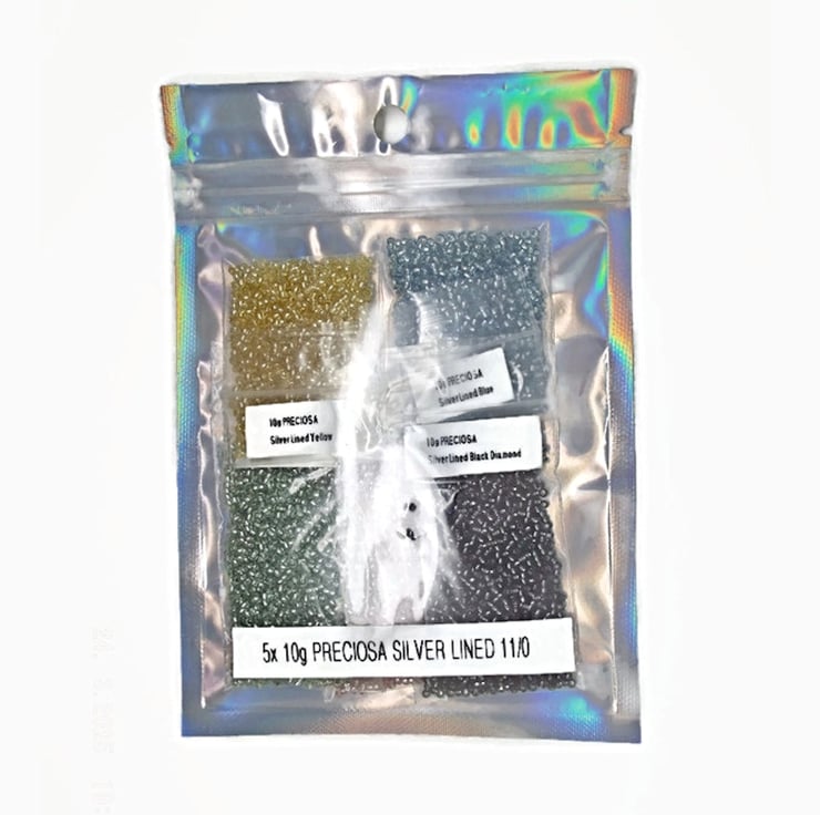 5x 10g Bags of Preciosa Size 11/0 Silver Lined Seed Beads for Bead Looming, Bead Weaving and other Beading Crafts. They are packed in small bags and housed together in a Silver Coloured Laser Zip Top Bag.