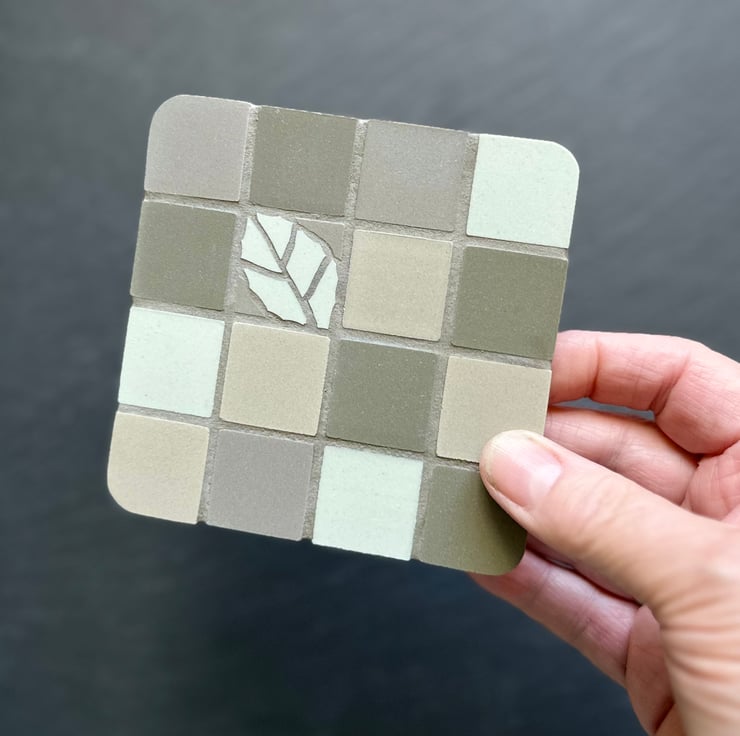 Two, rustic style, mosaic coasters in a random chequerboard design with a single, hand cut leaf motif. Created in beige and green shades of unglazed Cinca tiles, these coasters are grouted in grey, for a subtle cottage feel.