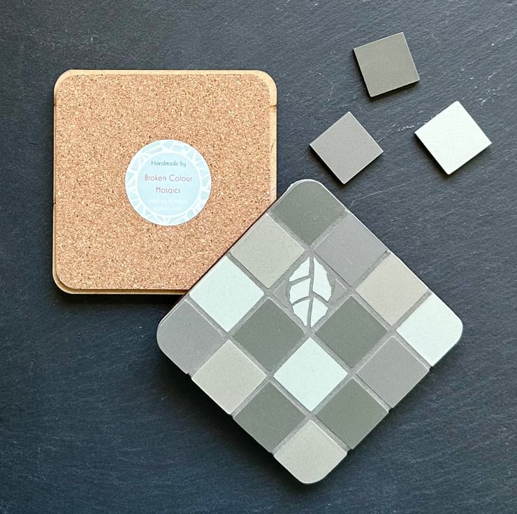 The coasters are 10cm x 10cm x 0.8cm. The mosaic is created on a wooden base and backed with cork.