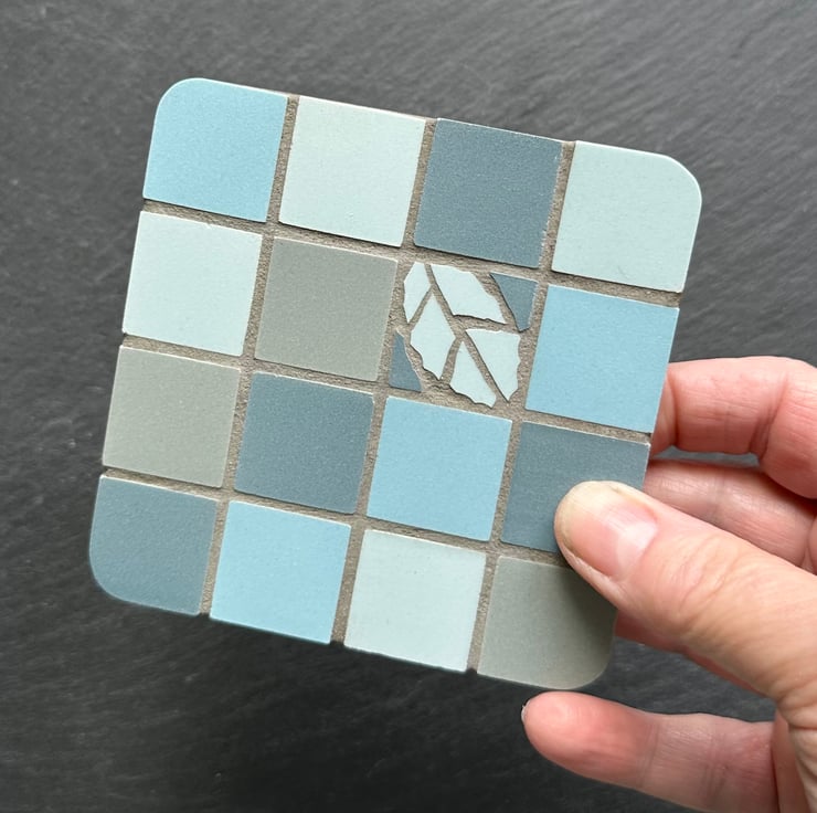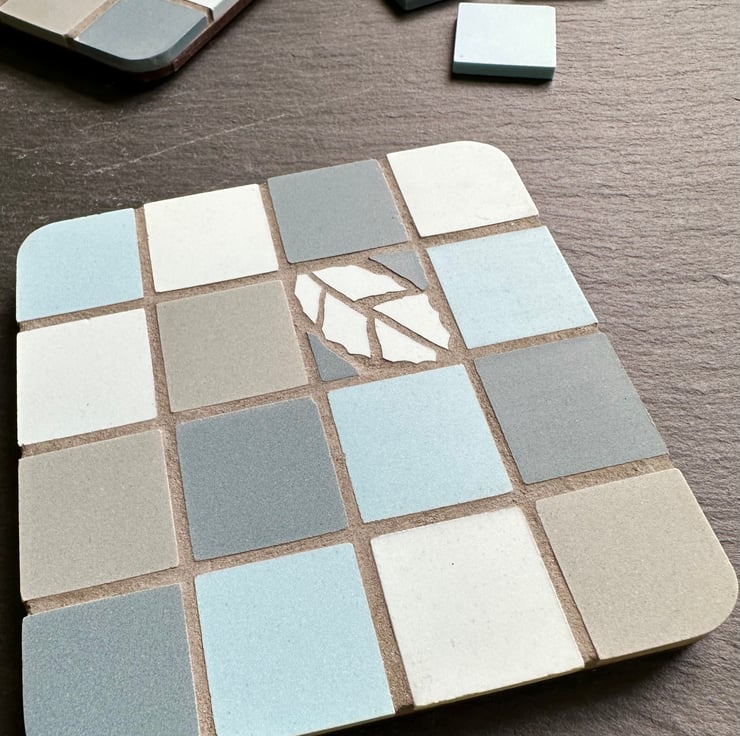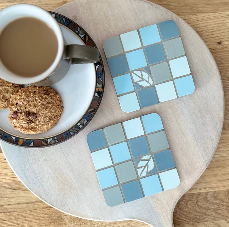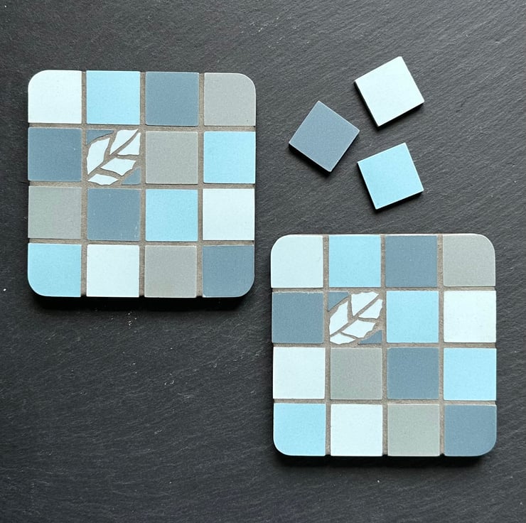 Two, rustic style, mosaic coasters in a random chequerboard design with a single, hand cut leaf motif. Created in an aqua blue palette with aqua, turquoise and grey, unglazed, Cinca tiles. These coasters are completed in grey grout for a subtle cottage feel.