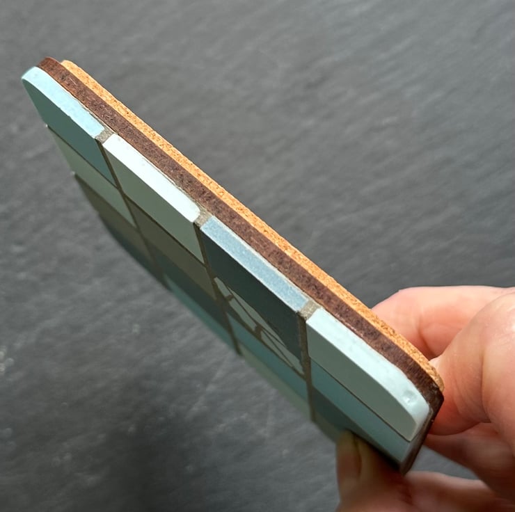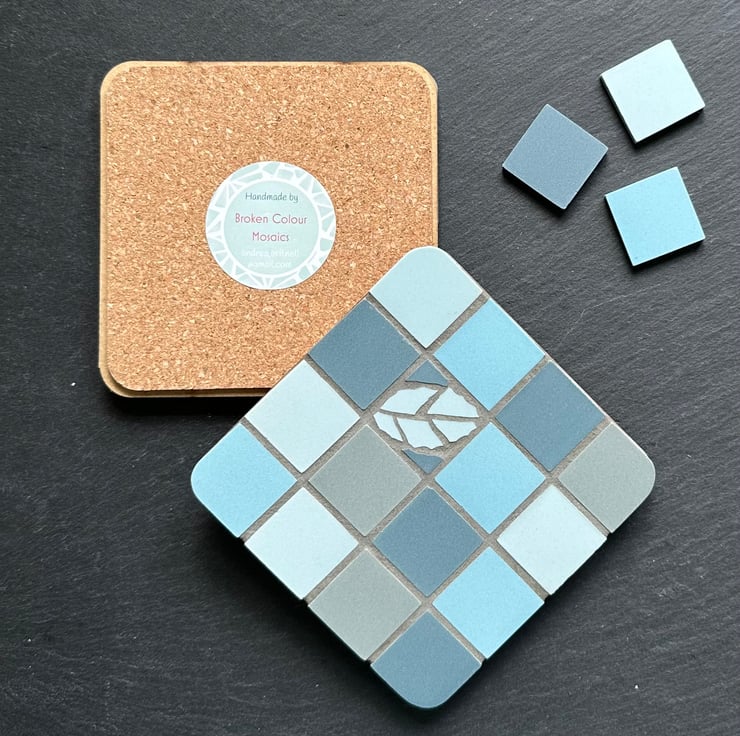 The coasters are 10cm x 10cm x 0.8cm. The mosaic is created on a wooden base and backed with cork.
