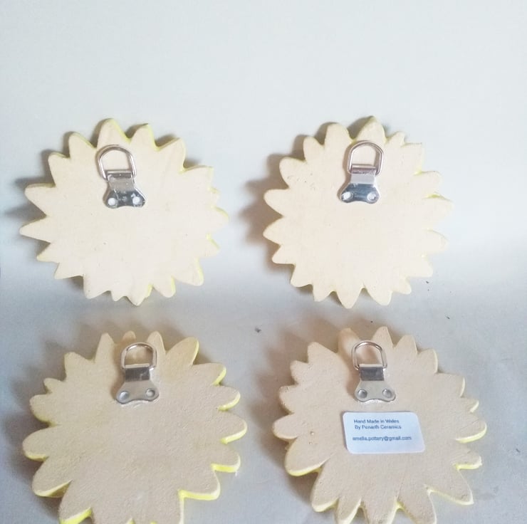 A set of 3 Sunflowers, made by hand in Stoneware ceramic. Decorated with vibrant yellow petals in relief and textured brown middle in relief. Suitable as wall hangings or Wall art decorative pieces.There are hooks or "D" rings on the back for hanging.10.5 cms diameter x .5 cms thick. Suitable for indoors or outdoors.