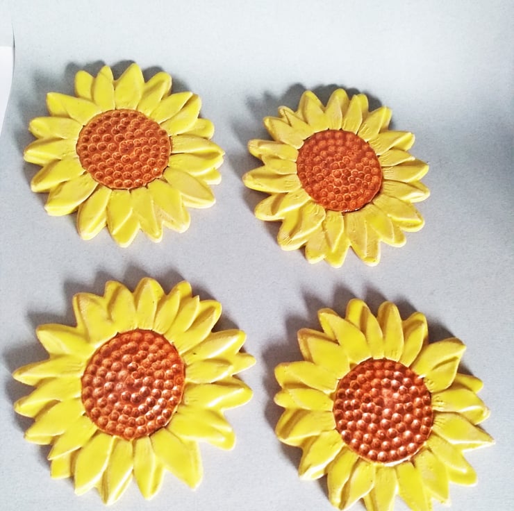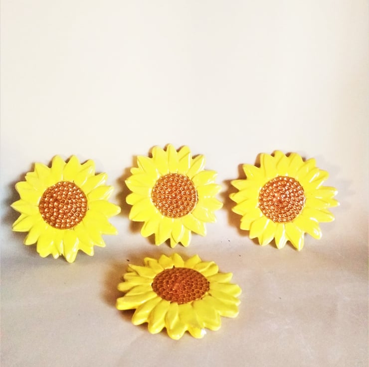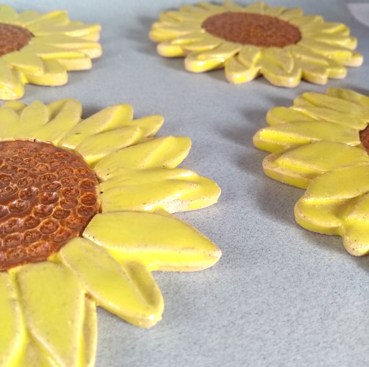 These little Ceramic Sunflowers were inspired originally by Vincent Van Gogh Sunflower painting. I had a print of the painting so wanted to create a Sunflower theme, (in the hallway) Wall tiles hanging plaques was the idea. So I made some brightly colored sun yellow relief tiles and decided to replicate them for people who like sunflowers and can now try them out on their walls too.