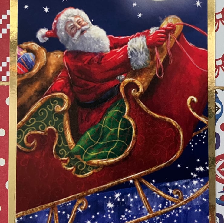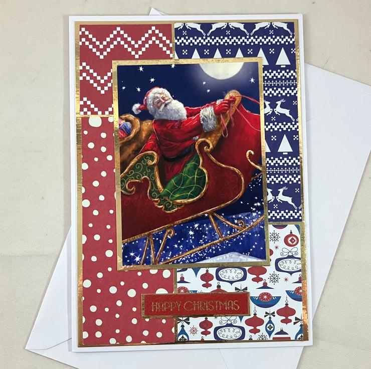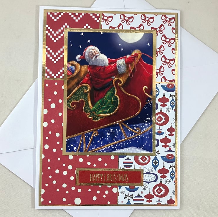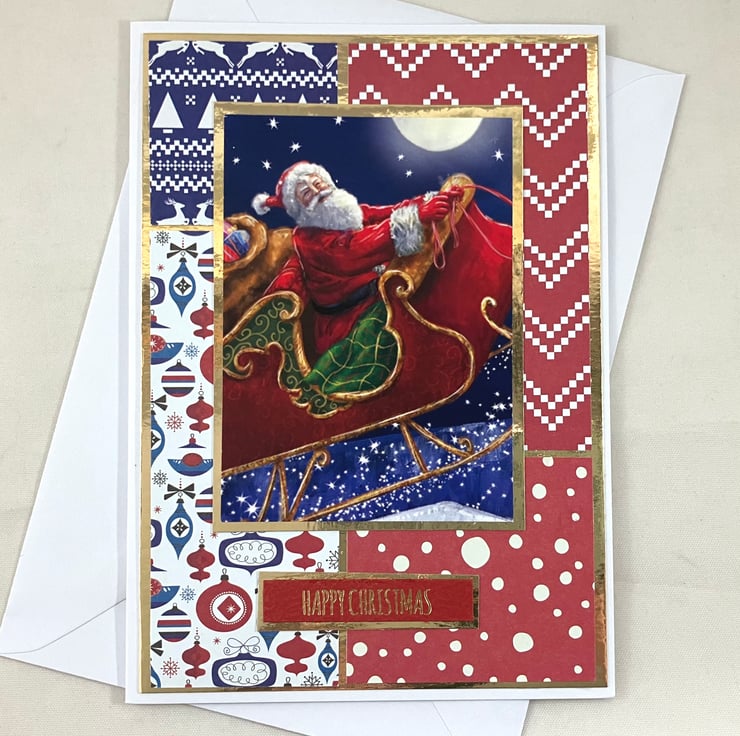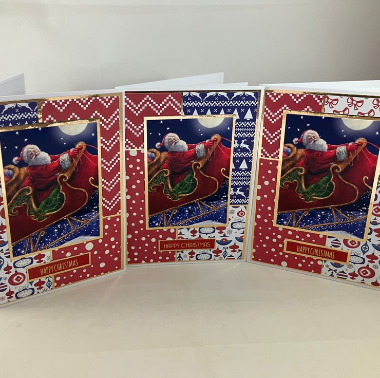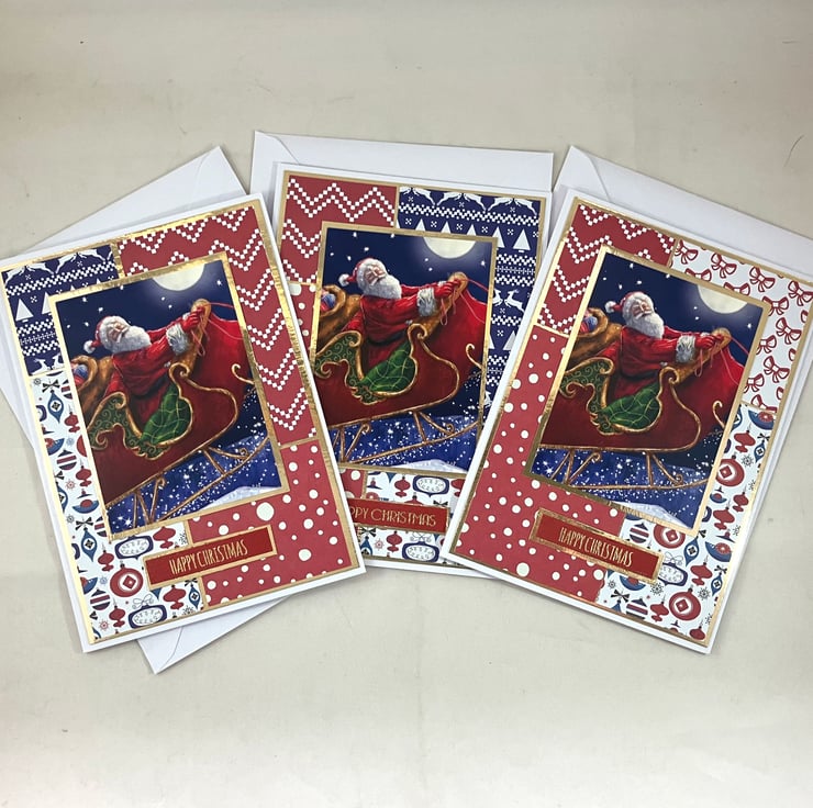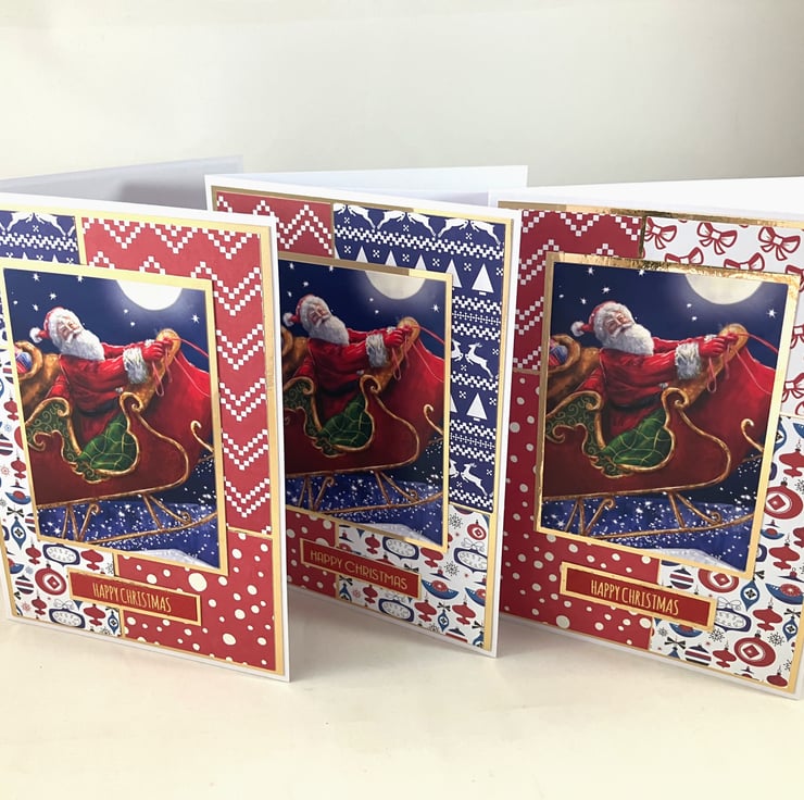 Pack of 3, A6 cards, each featuring a topper of Santa flying through the air on his sleigh. The images have been mounted onto gold mirri card and overlaid onto a background of 4 blocks of coordinating red, white and blue patterned papers, also mounted onto gold mirri card. The foiled sentiment reads: 'Happy Christmas'.
