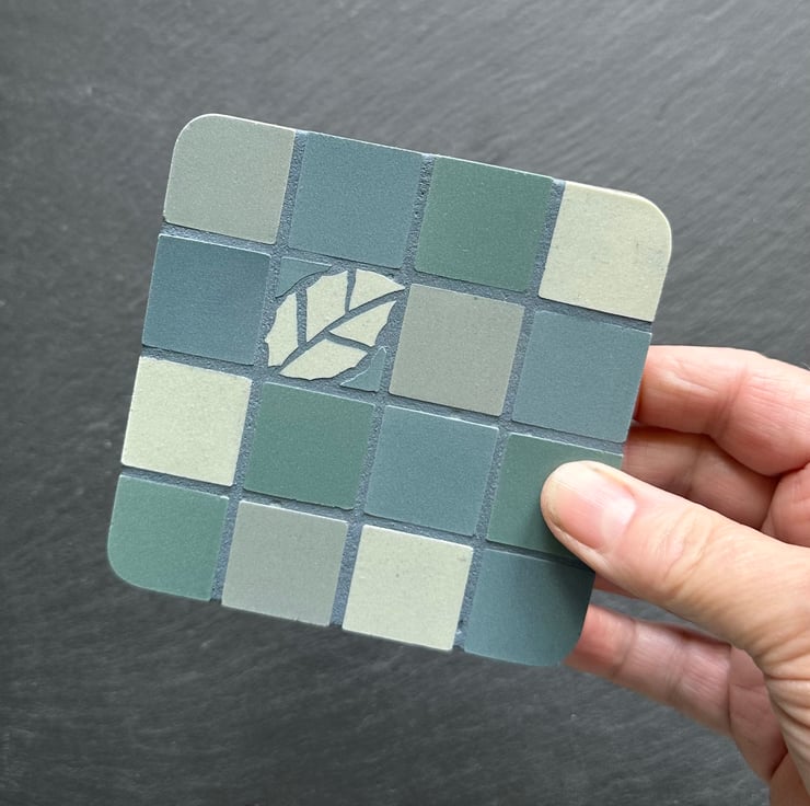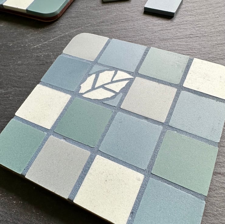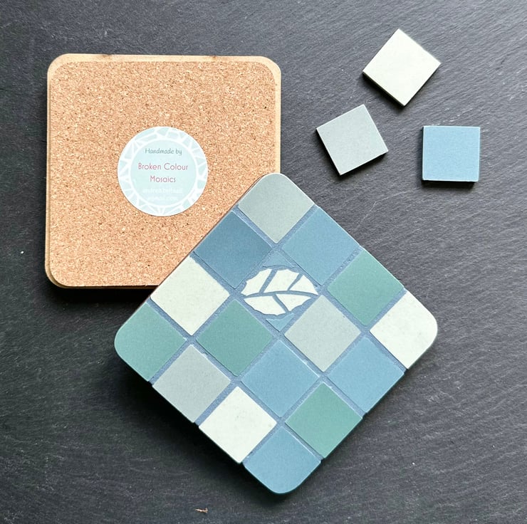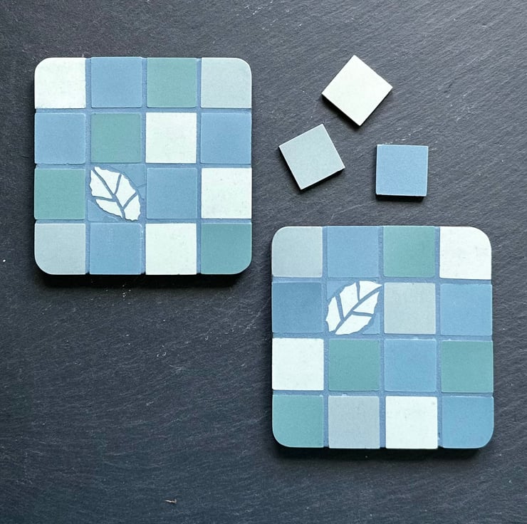 Two, rustic style, mosaic coasters in a random chequerboard design with a single, hand cut leaf motif. Created in a blue/ green palette with teal, green and grey unglazed, Cinca tiles. These coasters are completed in blue grout for a subtle cottage feel.