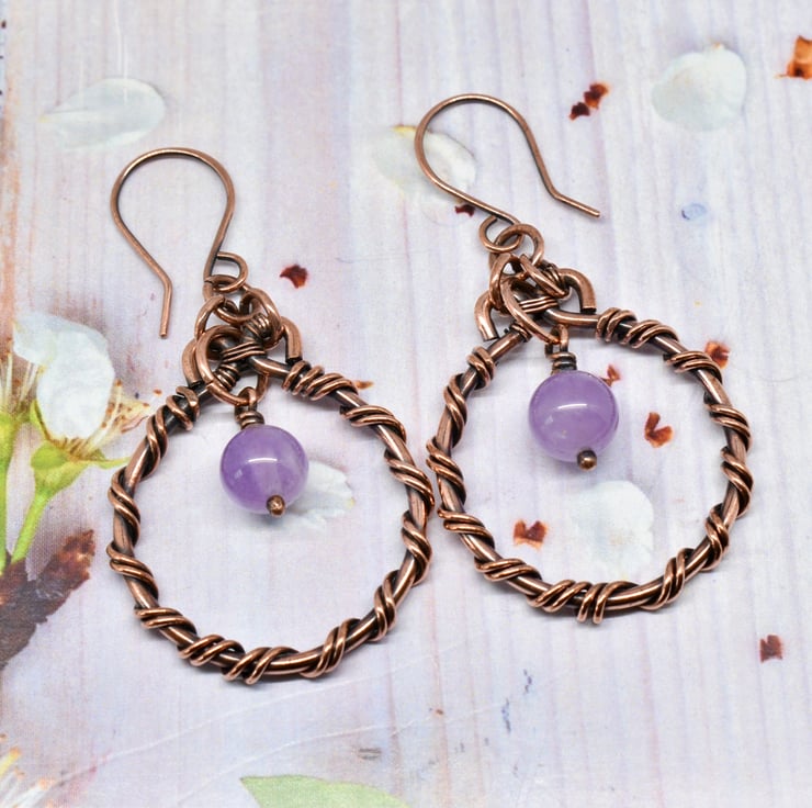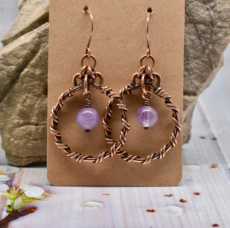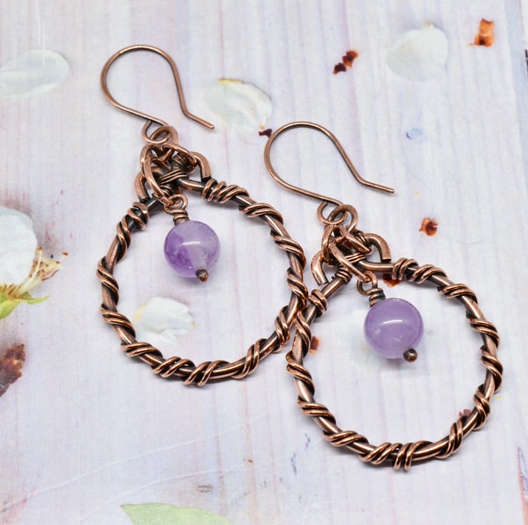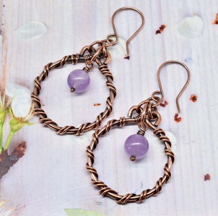 Amethyst hoop earrings which are completely handmade using solid copper wire with and amethyst drop in the centre.