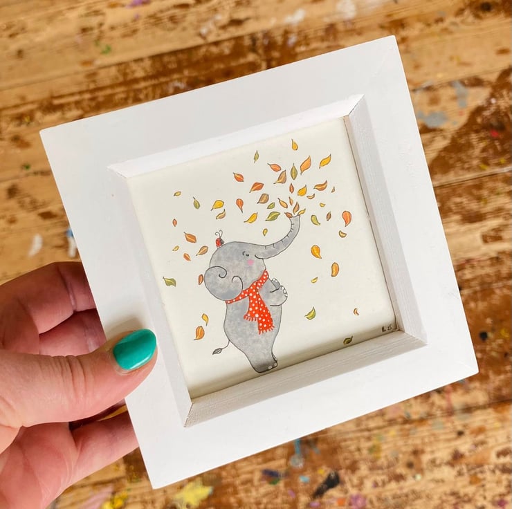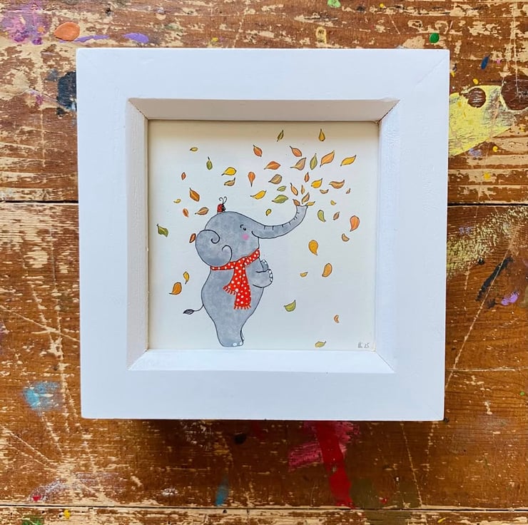 'The Leaf Blower' - sweet little original illustration in gouache, measuring 7.5 x 7.5 cm and set in a small, rustic, white frame measuring 9 x 9 cm, this gorgeous Autumnal illustration would make a perfect gift!