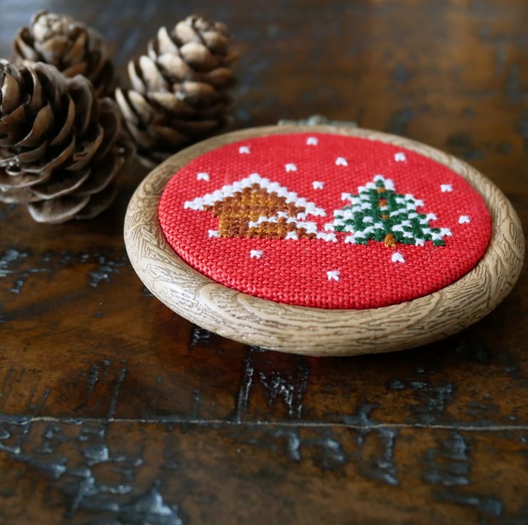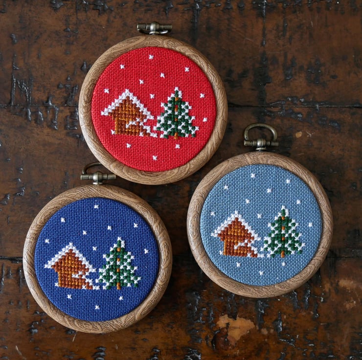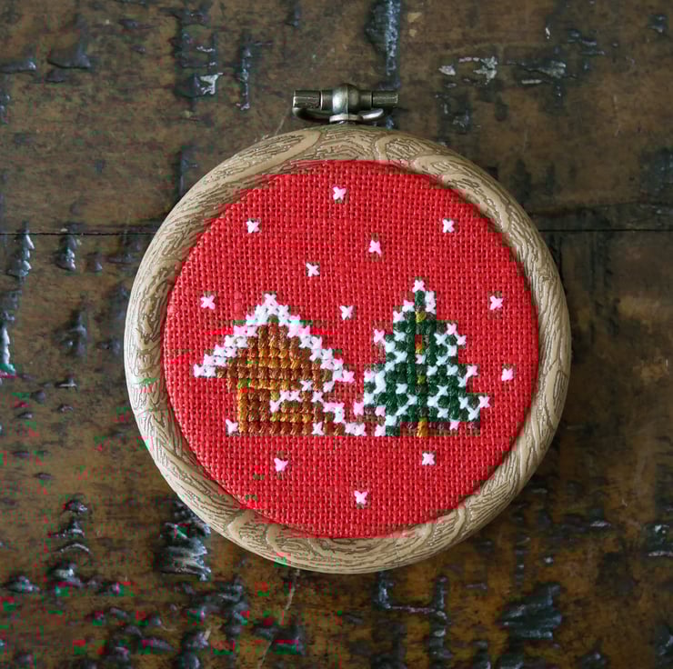 Bring a festive alpine vibe to your tree with this hand-stitched chalet cross stitch ornament on red fabric. Featuring a snow-covered lodge and pine tree with falling snow, it’s stitched in DMC threads and framed in a 3" wood effect flexi hoop. Ideal as a Christmas gift for mountain lovers, skiers, and handmade craft enthusiasts.