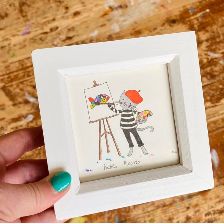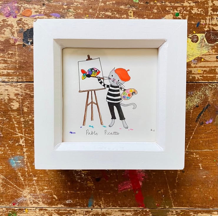 'Pablo Picatto' cute little framed original illustration in gouache, measuring 7.5 x 7.5 cm and set in a small, rustic, white frame measuring 9 x 9 cm, this gorgeous illustration would make a perfect gif, for the artist (or cat lover ) in your life!