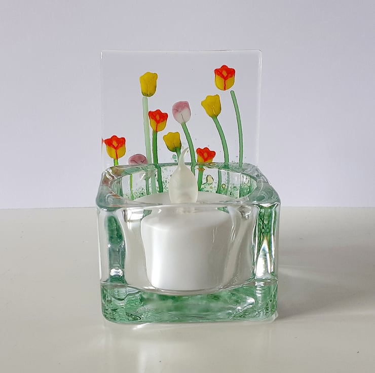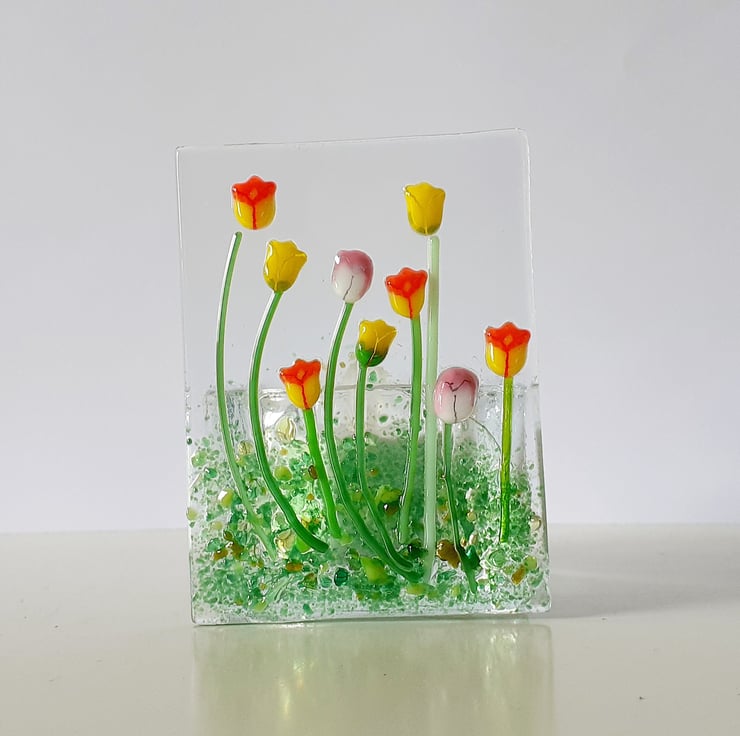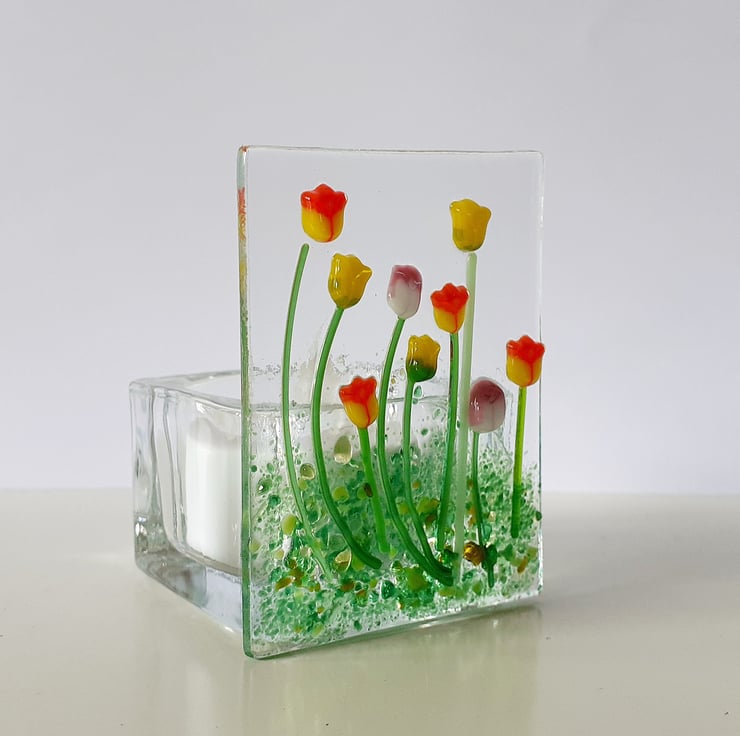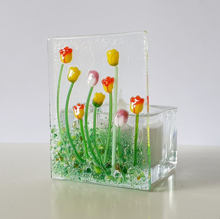 Fused glass panel tealight holder, decorated with mixed tulips.
