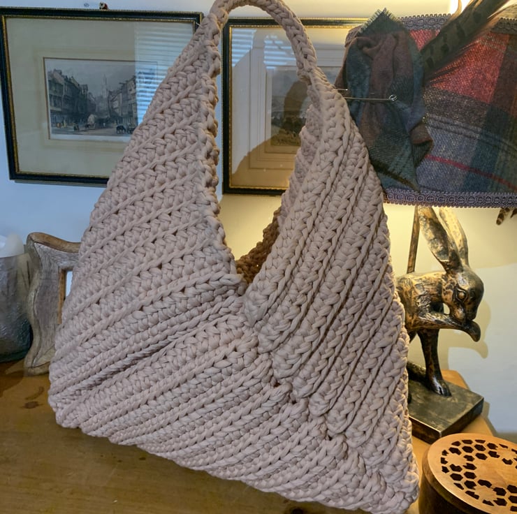 This gorgeous handmade light pink/peach handbag is made from recycled material. It would be perfect for any occasion. Not lined.