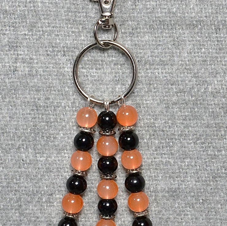 I love this classy little bag charm. There’s something very charming about the combination of the peachy orange beads and the black, separated by the pretty silver spacers. The three dangles are hung on a silver-coloured split ring and attached to a lanyard clip/lobster clasp.