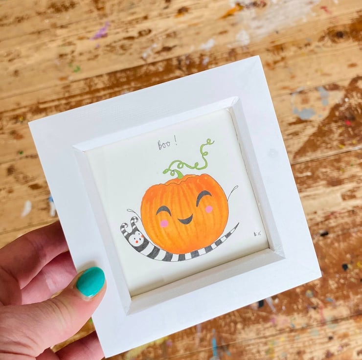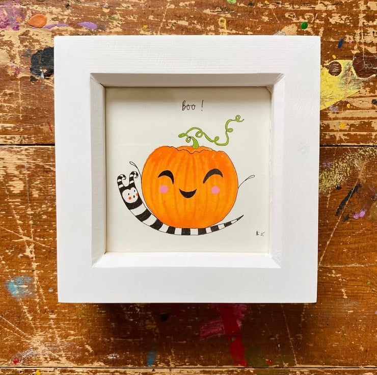 Kind of spooky, but very cute, framed original illustration in gouache, measuring 7.5 x 7.5 cm and set in a small, rustic, white frame measuring 9 x 9 cm, this gorgeous Halloweeny illustration would make a perfect gift for the halloween lover in your life!