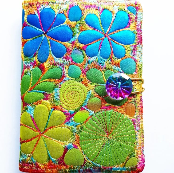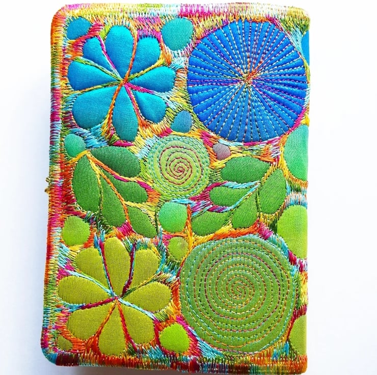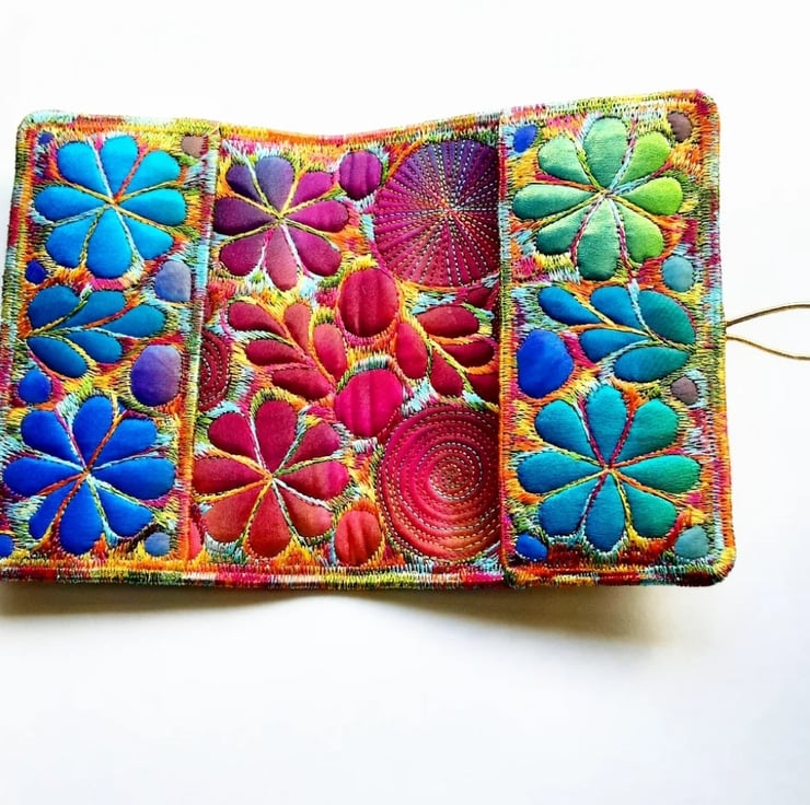 This is a handmade machine stitched fabric passport holder. Made from layers of fabric including hand dyed Egyptian cottons and silks.