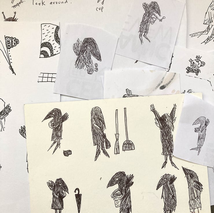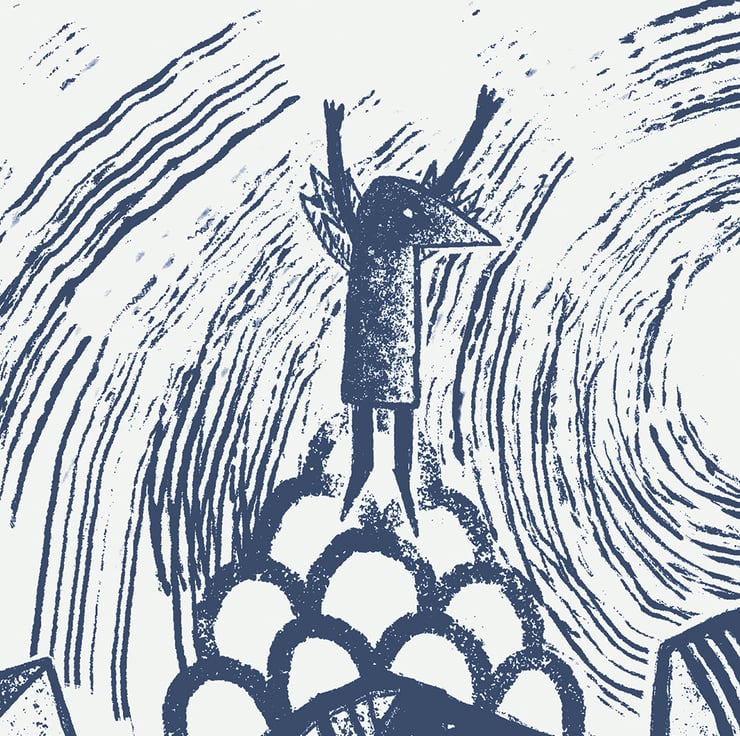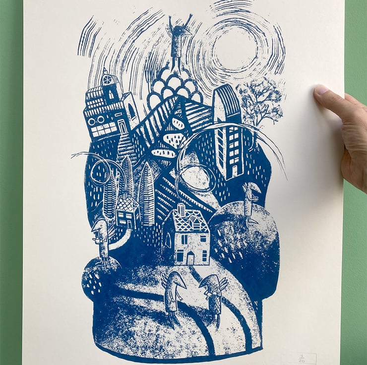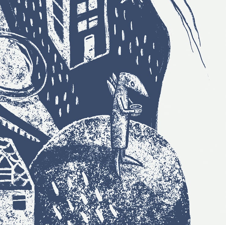 This print is a collaboration with my friend and ceramic artist Bev Seth. Bev makes all sorts of weird and wonderful clay creatures, and this print is based on her 'Caretaker Birds'. These fictitious birds have distinct personalities and are shown doing various things in their world, collecting things, making tea and relaxing too. I used Bev's original sketches and her ceramics (see in pics) as a basis for the composition, imagining the world in which they might live! You can find more of her work on her website: