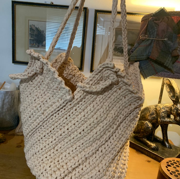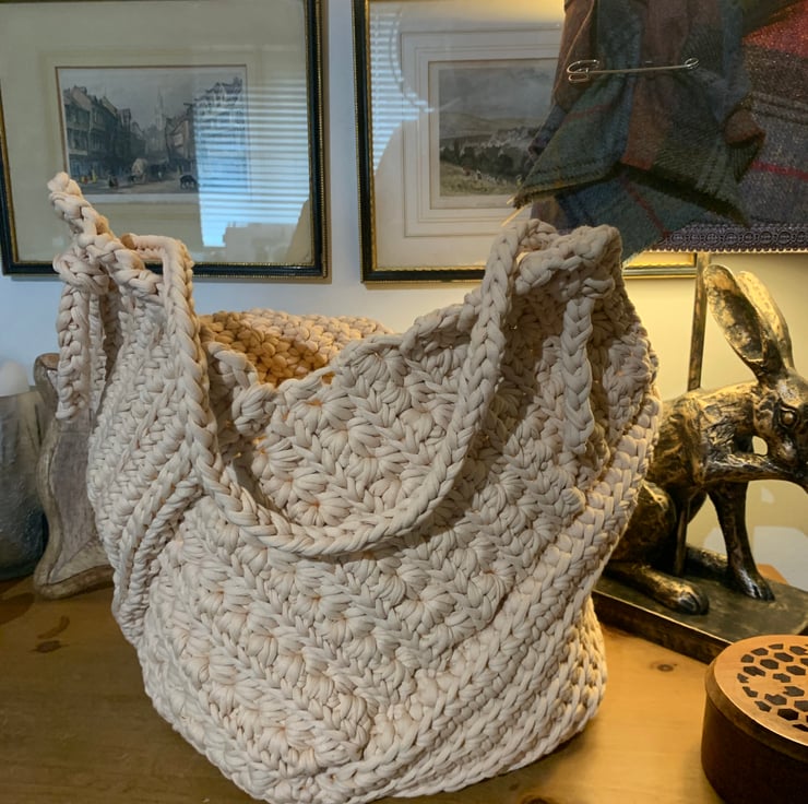 This gorgeous handmade cream handbag is made from recycled material. It would be perfect for any occasion. Not lined.