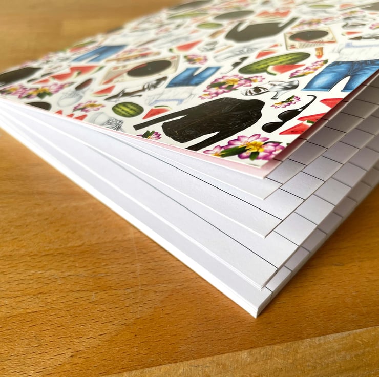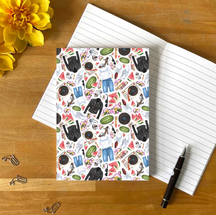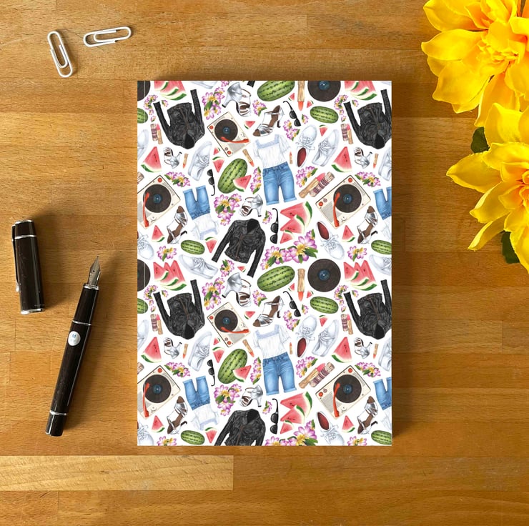 Inspired by one of the most iconic love stories of the 80s, this Dirty Dancing-themed A5 notebook features hand-drawn pencil illustrations capturing Baby’s sweet boho top, denim shorts, and Johnny’s signature leather jacket. Other nostalgic touches include a retro record player, silver dancing shoes, and—you guessed it—the watermelon!