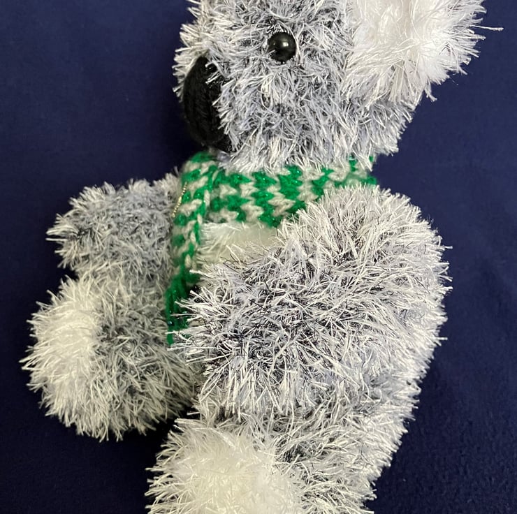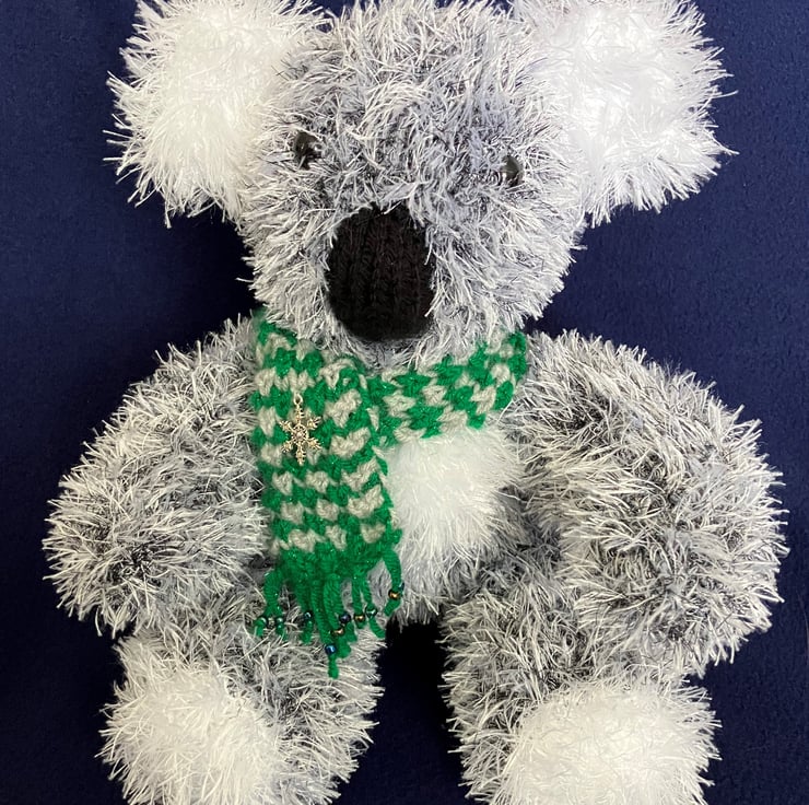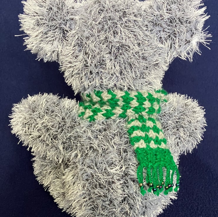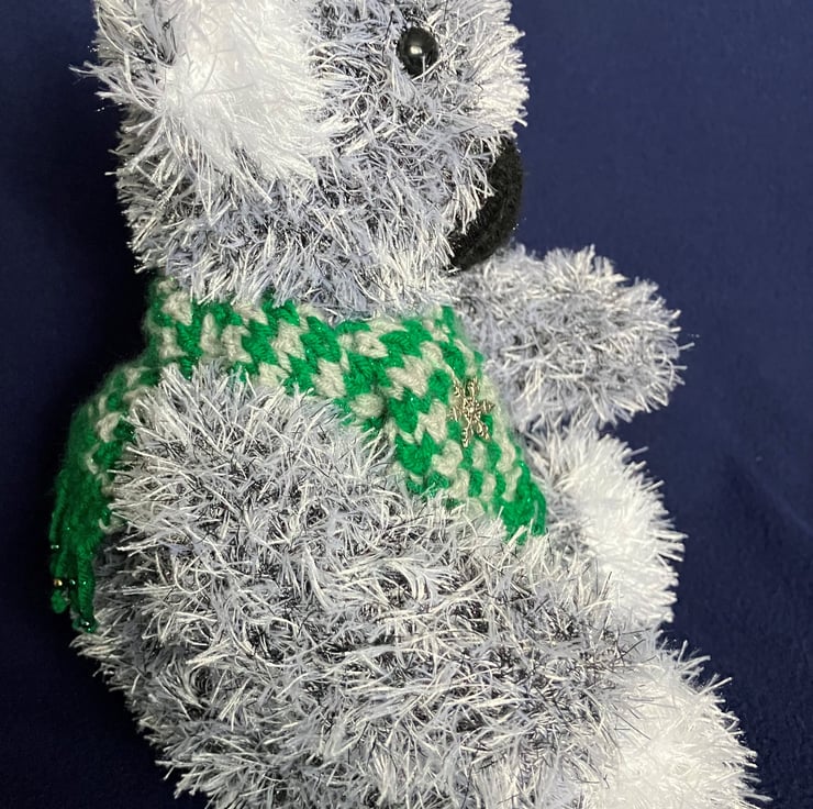 This festive Christmas Koala is knitted with grey and white tinsel yarn. It wears a warm knitted scarf in colours of green and grey glitter yarn. The scarf also features a metal silver tone snowflake charm and beaded tassels.