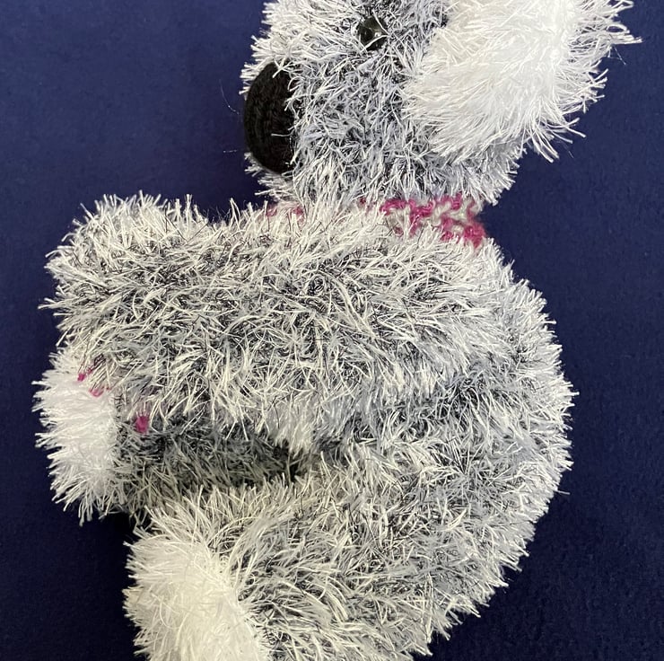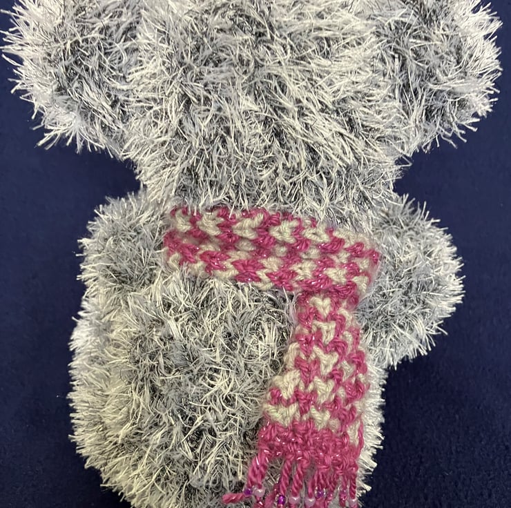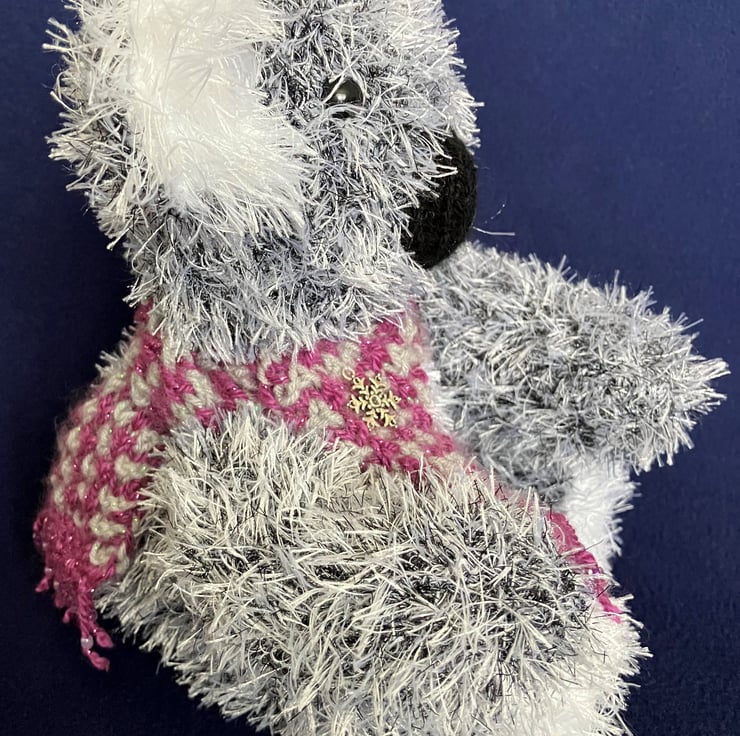 This festive Christmas Koala is knitted with grey and white tinsel yarn. It wears a warm knitted scarf in colours of pale purple and grey glitter yarn. The scarf also features a metal silver tone snowflake charm and beaded tassels.