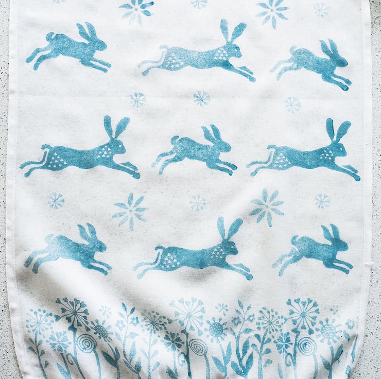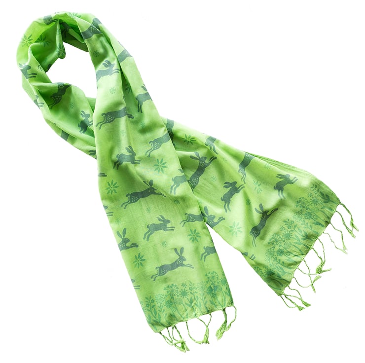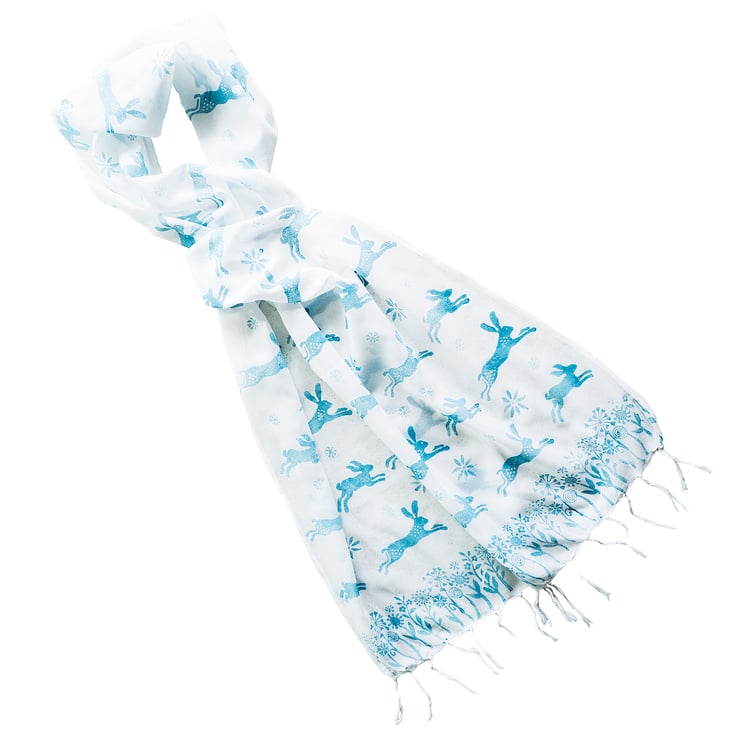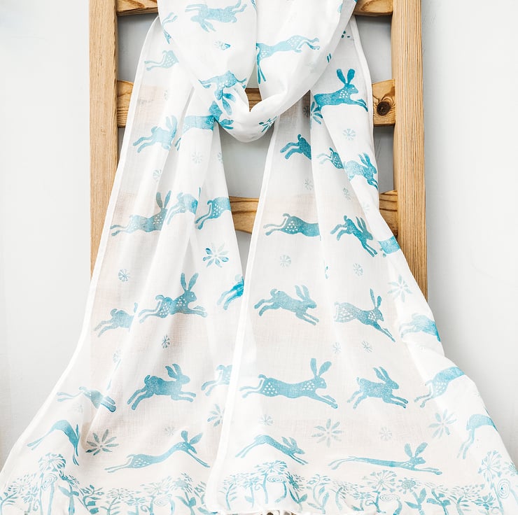 This beautiful organic cotton scarf has been block printed by hand to create a unique design depicting hares with a border of wild flowers and grasses. The background colour is a white and the hares and borders are printed in a duck-egg blue non-toxic fabric paint.