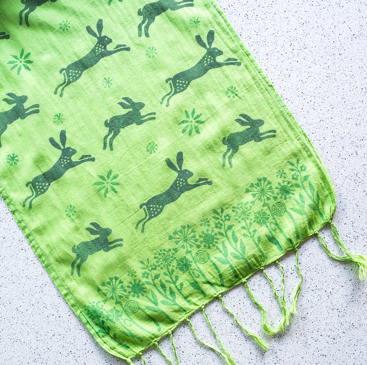 Due to the hand-printed nature of the scarf, each one will be unique and the exact placement of the elements will vary slightly between each scarf. There will be variations in the colour density and textural appearance between each hare and border. These differences are part of the charm of a hand printed product and should not be seen as 'faults'.