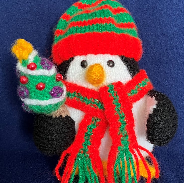 It’s beak, webbed feet and the Christmas tree star have been knitted in a golden yellow.