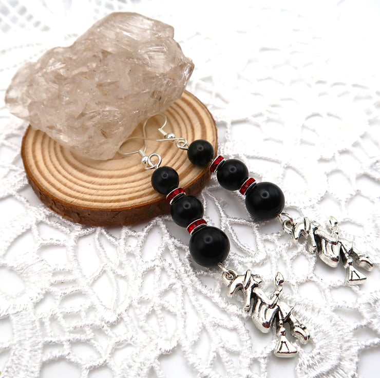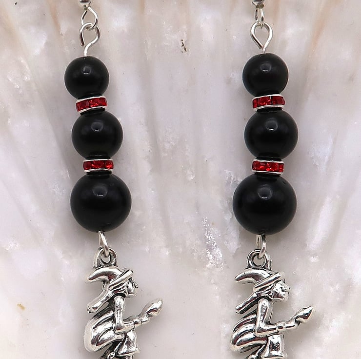I have used 6, 8 and 10mm genuine Obsidian Beads. The Red Rhinestone Spacer Beads are 6mm. The Witches on Broomstick are Tibetan Silver. The Ear Wires are Sterling Silver.