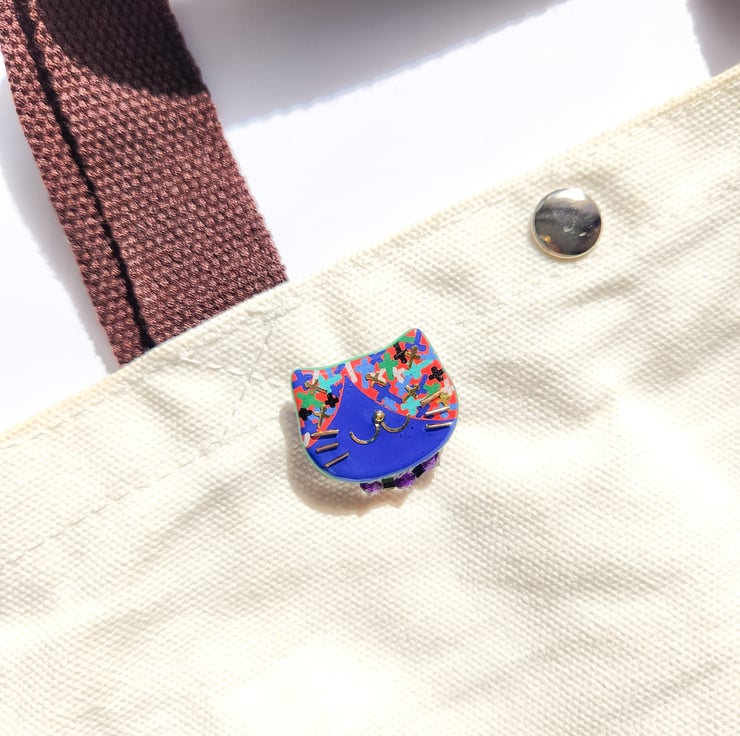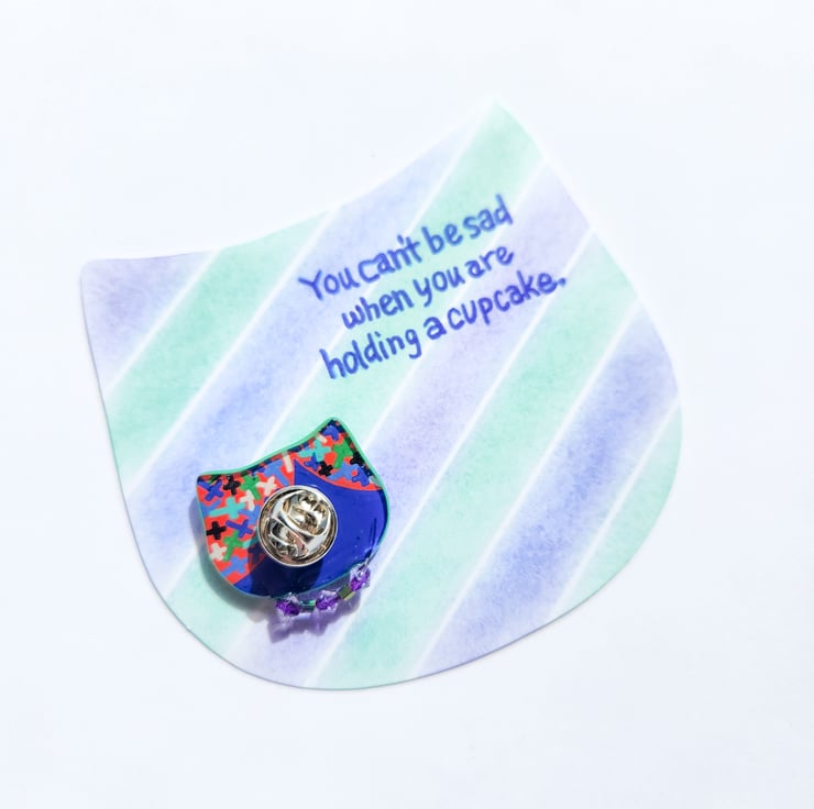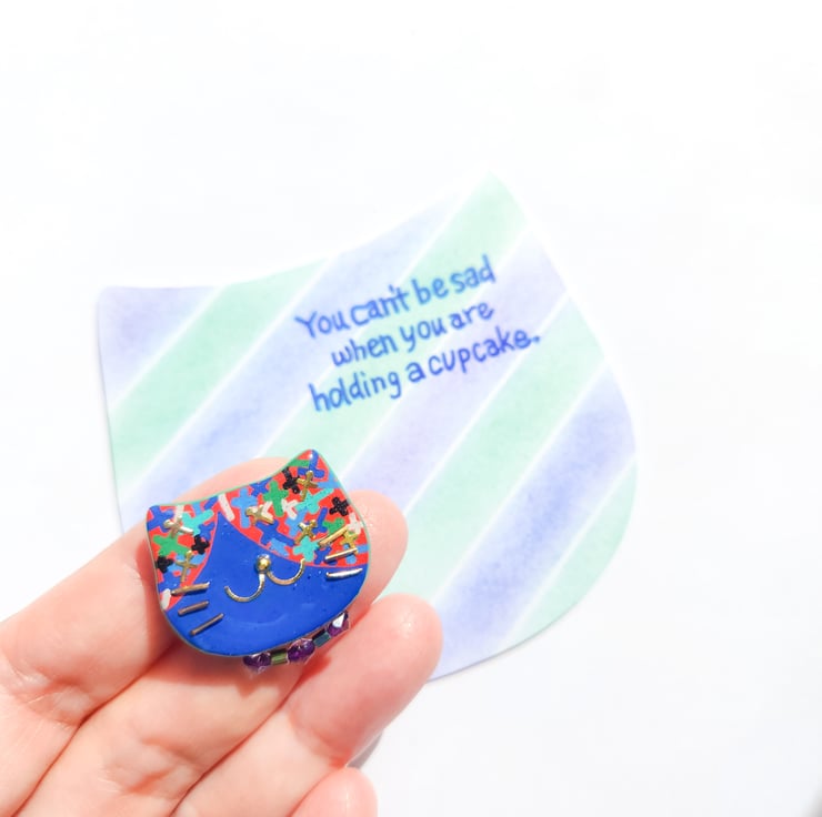 Bring a smile to your day with this cheerful hand-painted cat brooch. Made from shrink plastic and finished with delicate hand-painted details. Each brooch is completely unique, no two cats are ever the same! Cat brooch comes pinned onto a softly hand-coloured card, featuring an uplifting phrase.