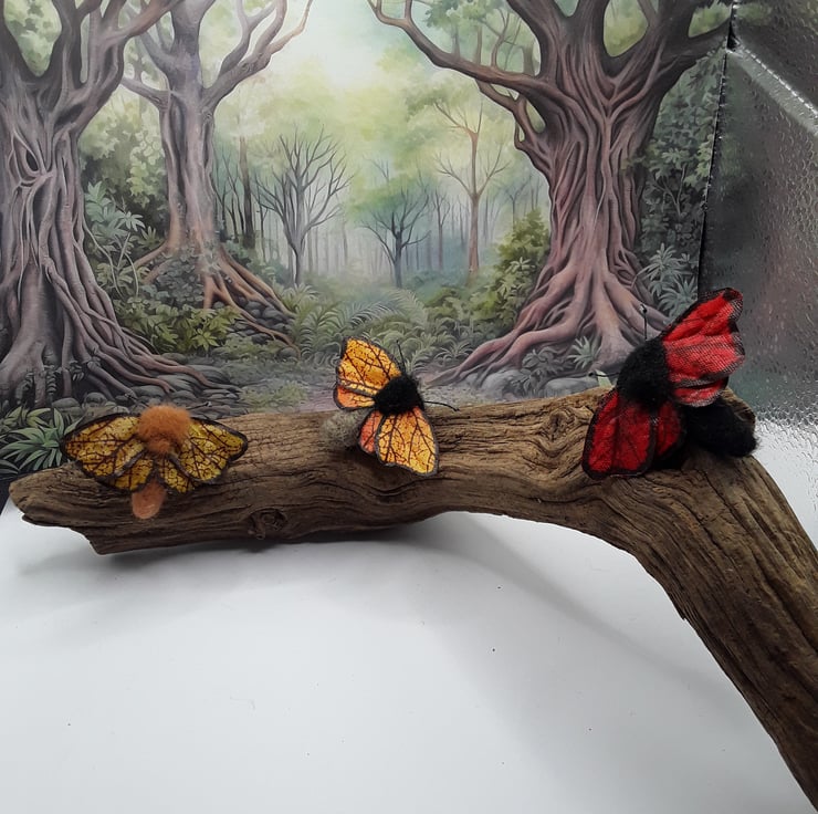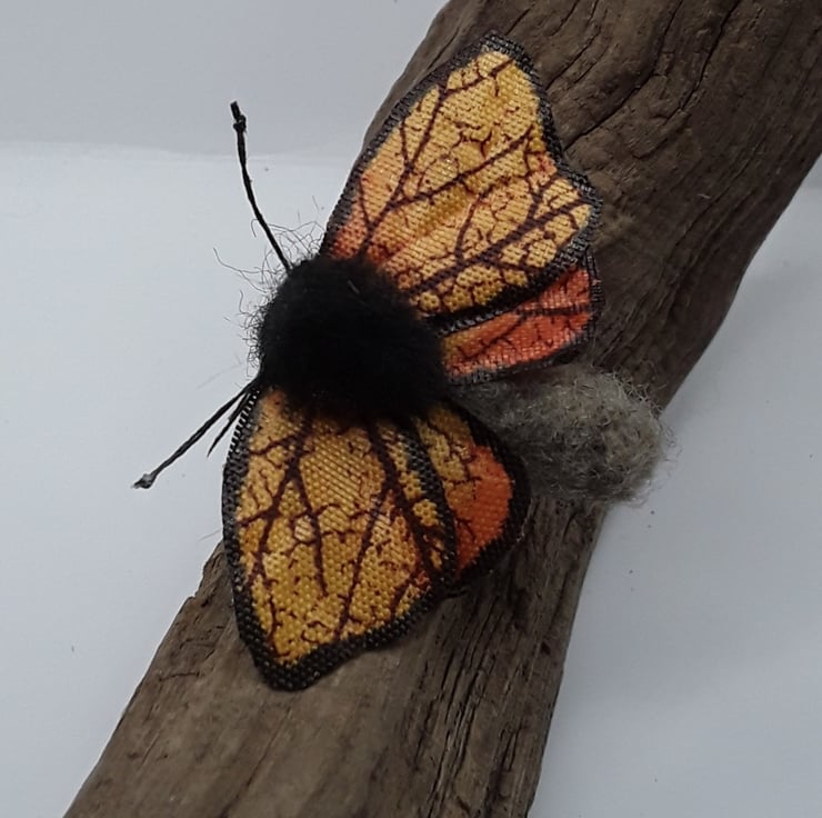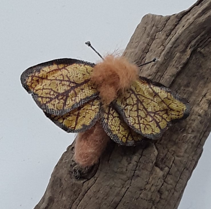 Pretty little textile moth brooch, the body Is needle felted and has a brooch pin securely attached, the wings are printed textile,would look great pinned to a shirt,