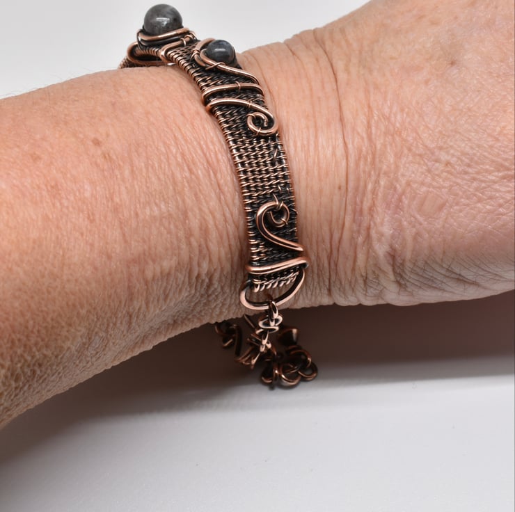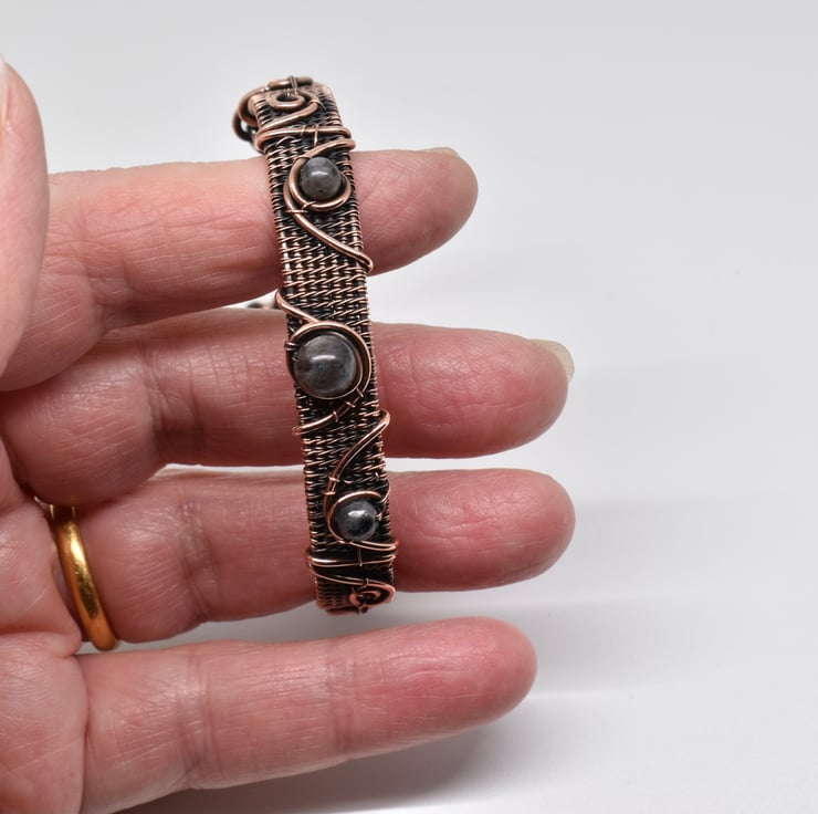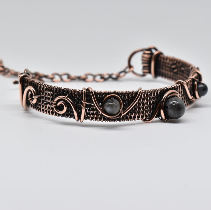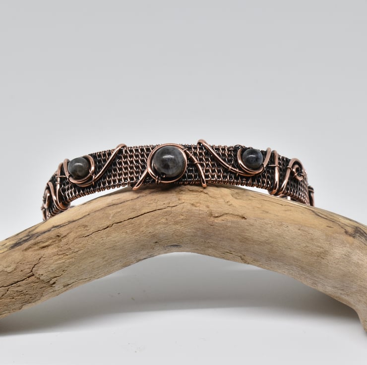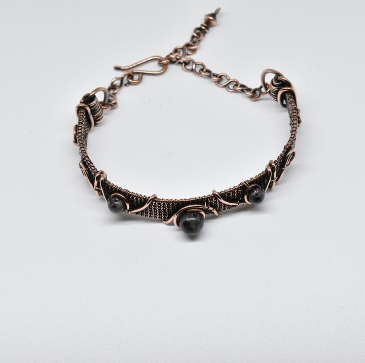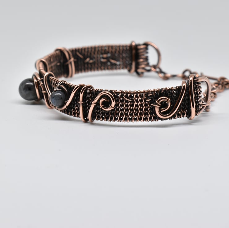 I have hand woven this dainty cuff using solid copper wire then added lavakite beads and copper wire to decorate it.