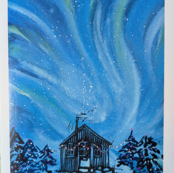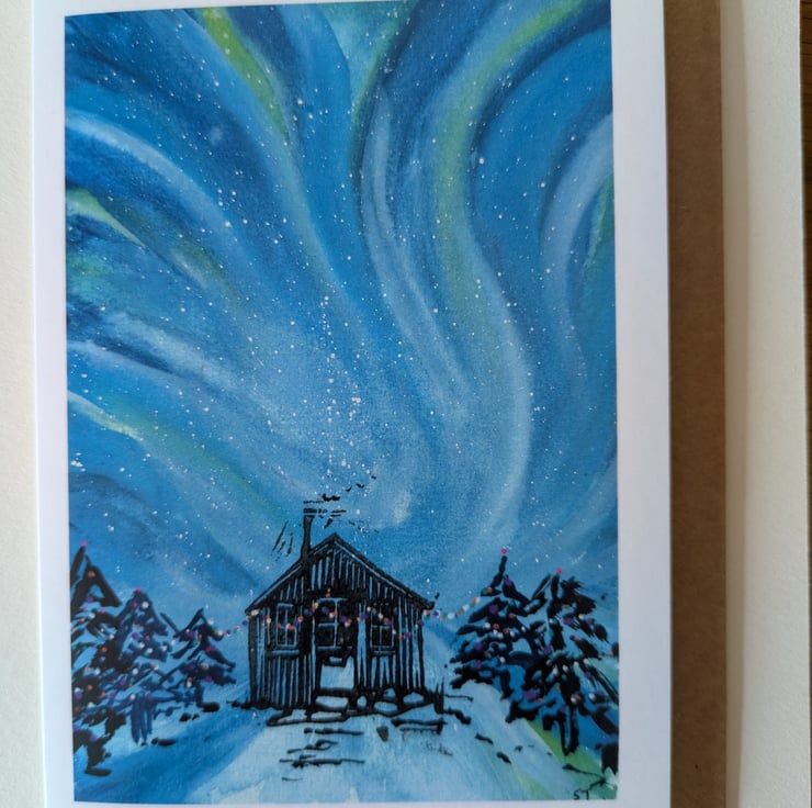 Little lino cut quirky Christmas hut featured in the festive scene of the Northern lights . A6 card 270gsm crescendo with kraft envelope.