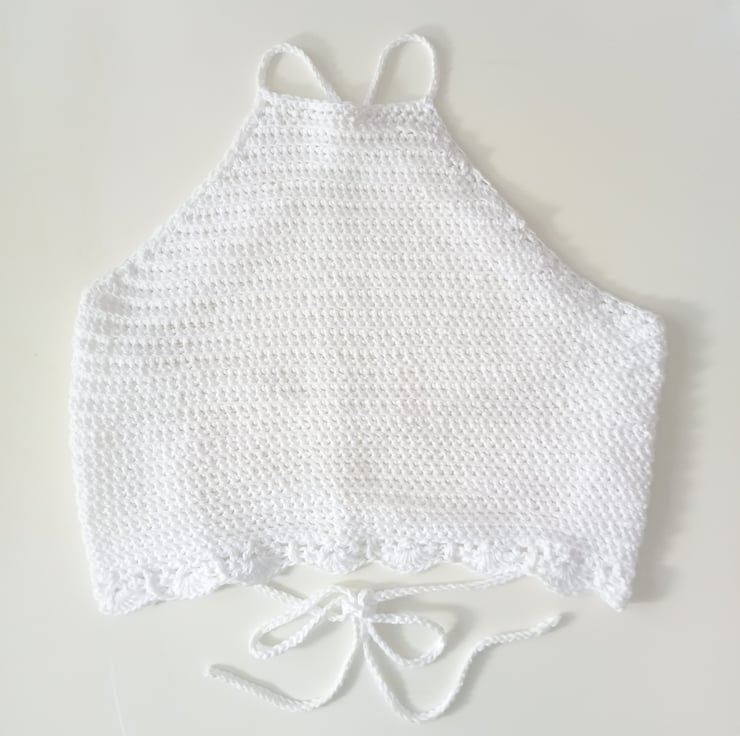This crochet PATTERN is for a ladies pretty summer crop top. To fit adult medium. Length: 35 cm or 14 inches. Width at top: 14.5 cm or 6 inches. Width at bottom: 60 cm or 24 inches excluding straps. The crop top is crochet in aran cotton yarn using 5 mm crochet hook.
