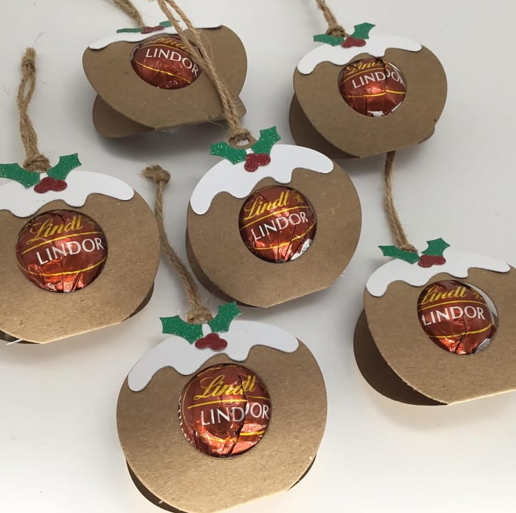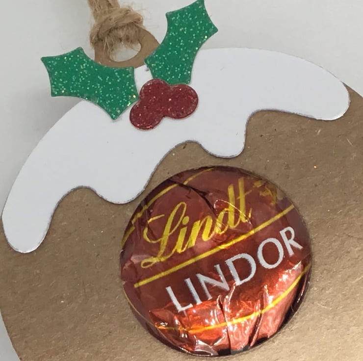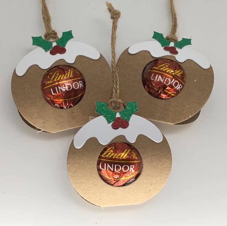 A handmade Christmas pudding hanging Christmas decoration, designed to hold a single Lindt chocolate. CHOCOLATE NOT INCLUDED in order to minimise postage costs. I am happy to include the chocolates for an additional cost if needed, please message for details.