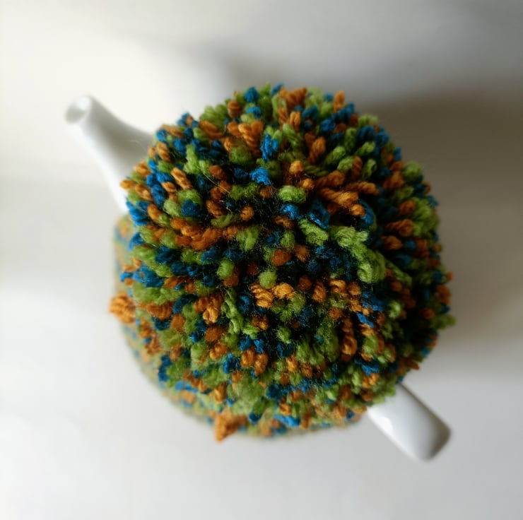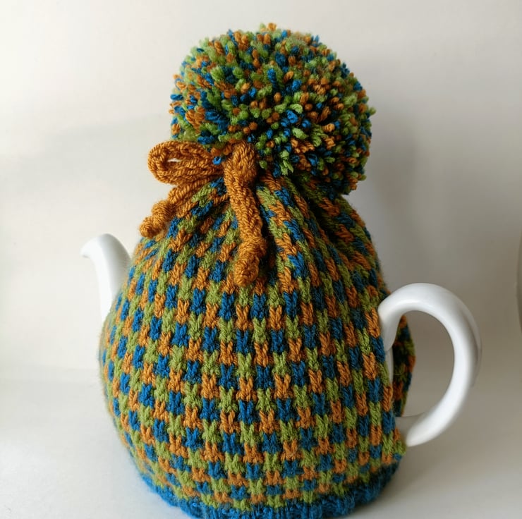 A hand knitted tweed stitch tea pot cosie in rich autumnal colours, with an oversized pompom atop. Starting at the hem I have knitted the rib in a teal blue coloured yarn. Then using three different coloured yarns; teal blue, gold and apple green, I have knitted a wonderful tweed stitch tea cosie body. There is an oversized pompom, nestled on the top, in the same three colours and a little gold scarf tied in a bow under it. This stitch ensures a good fit around the pot, yet has enough ease for a swift removal when a 'top - up' is required. The tea pot handle peeps through the side opening so it dosnt get too hot to handle. A perfect house warming gift, or for yourself...... just because it looks pretty on the kitchen work top.