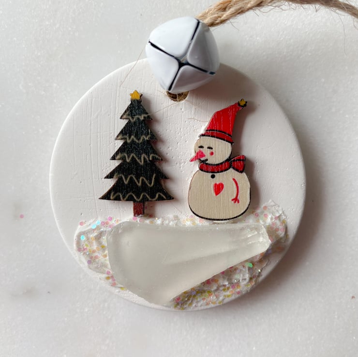 Hanging ceramic decoration with a piece of sea glass and finished off with glitter and a bell.