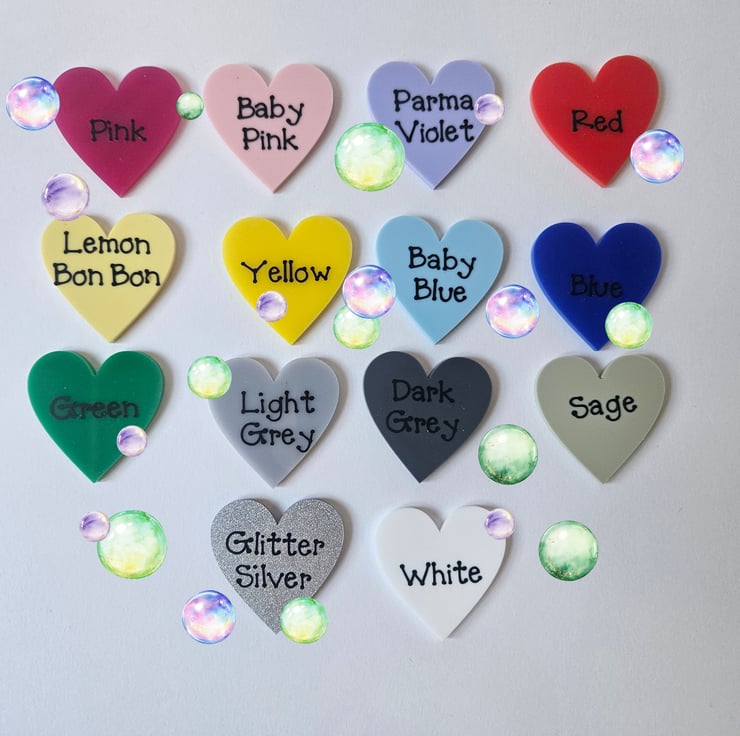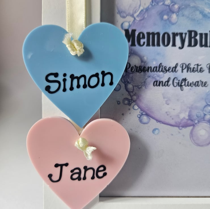 Each frame also be personalised to you requirements so please feel free to change any of the wording on the frame. The heart Embellishments are made from an Acrylic and these are available in various colours - please look at the photos for the range available. . With so many options you can get a frame made exactly how you would like.