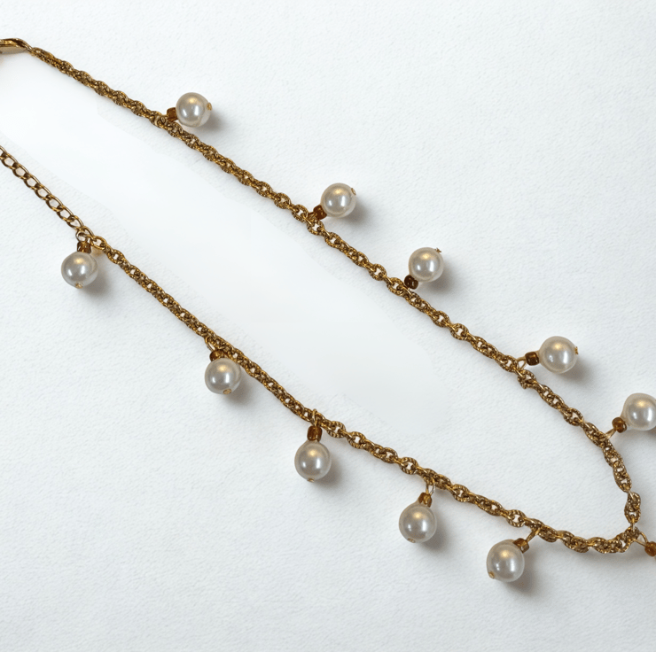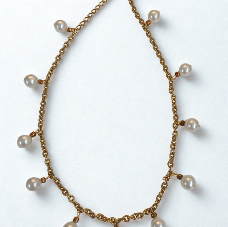 A beautiful good plated chain with pearls attached at intervals with contrasting little tiny tortoiseshell covered glass beads. This necklace is made entirely from recycled materials! The chain is 18 inches long with a lobster catch.