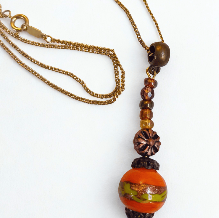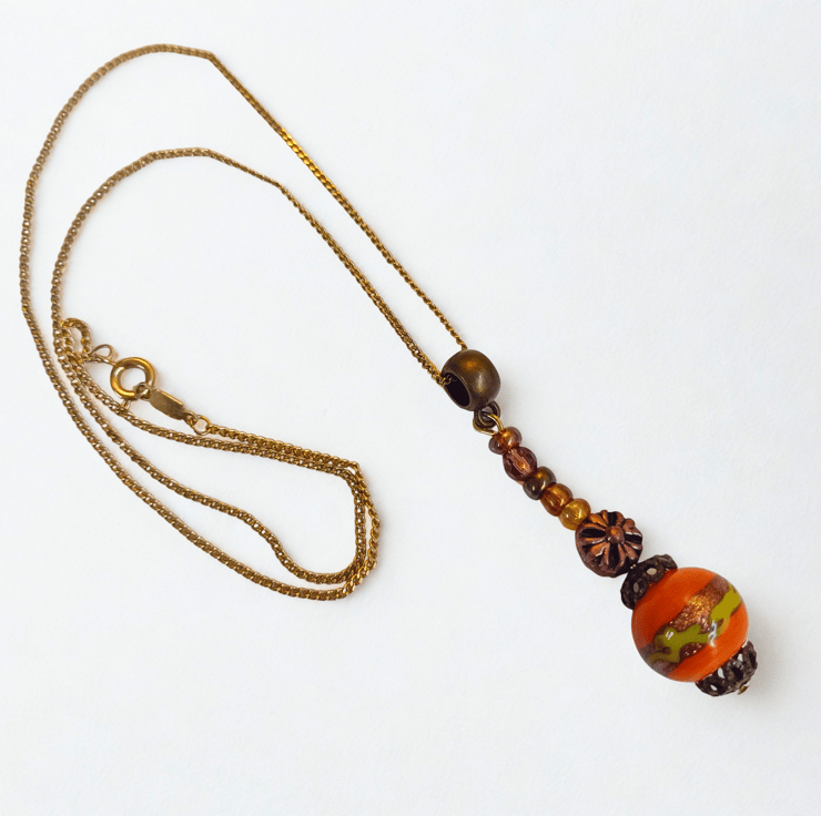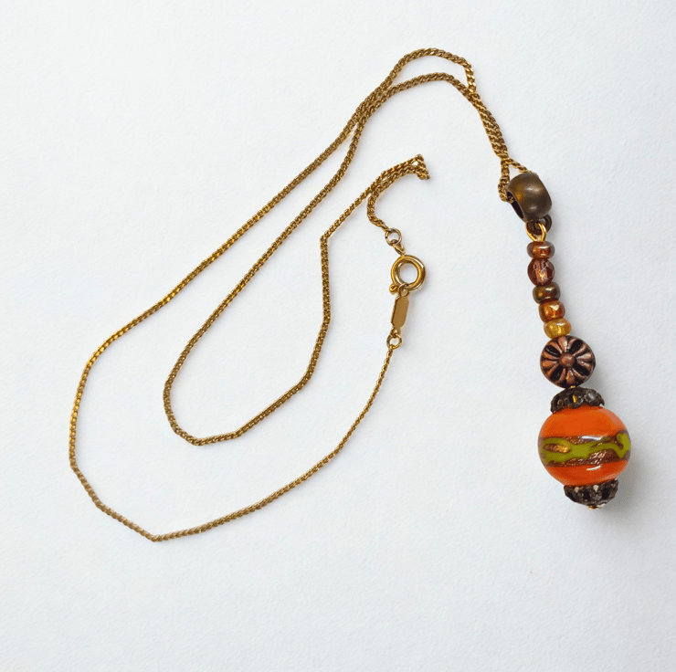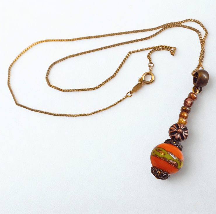 Gorgeous Mexican style necklace, a hand painted bead in spicy orange, green and gold with dark antique casings, a bronze flower with tiny glass beads. Hanging on a gold plated chain with a lobster catch. Matching earrings available in a separate listing.