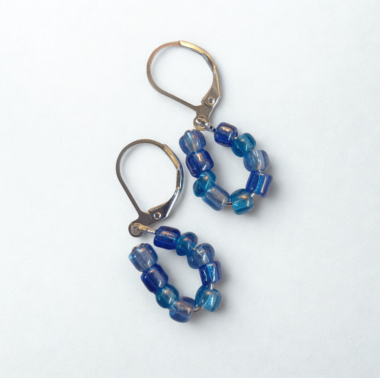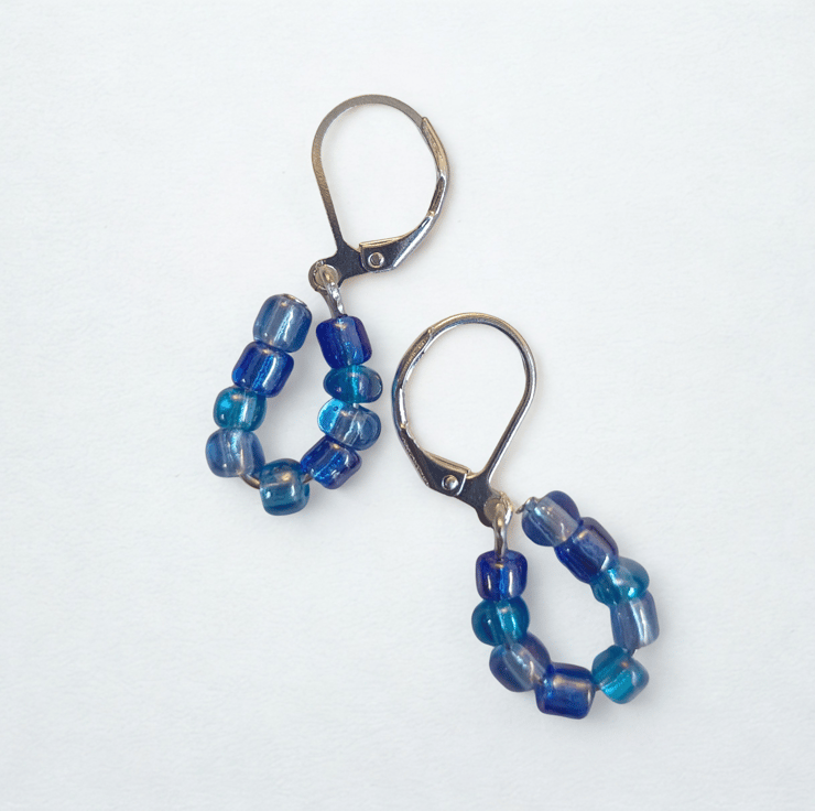 Little tiny glass beads in all the blues on a silver wire curled into a loop on nickel free 925 silver lever back hooks.