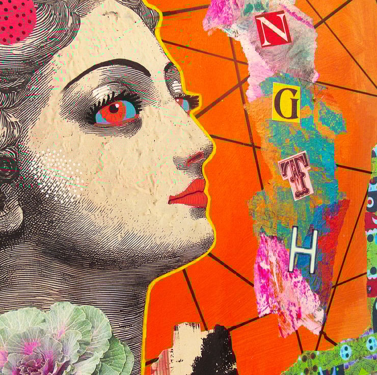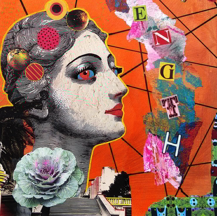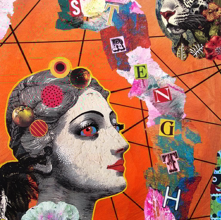 Striking mixed-media collage painting celebrating feminine power and inner strength, depicting a classical portrait with bold color, a fierce leopard, and the word “STRENGTH” spelled out in eclectic typography, this piece radiates empowerment and female resilience. This artwork is about courage, intuition, and the divine feminine. Against a fiery orange base a goddess-like figure gazes with unwavering confidence. A watchful leopard appears as a spirit guide, a reminder of grace, power, and protection. This unique surreal artwork is perfect for modern feminist art lovers, eclectic home décor, or a unique gift for a strong friend. This hand crafted OOAK artwork is in acrylic, collage and drawing pens and measures 10 x 14 inches on 2mm deep board. Perfect to pop straight into any standard sized frame (or munt). It comes to you unframed and will be hand signed on the front by Bea before shipping.