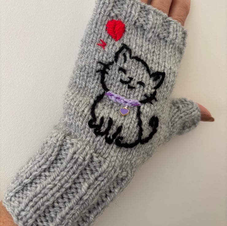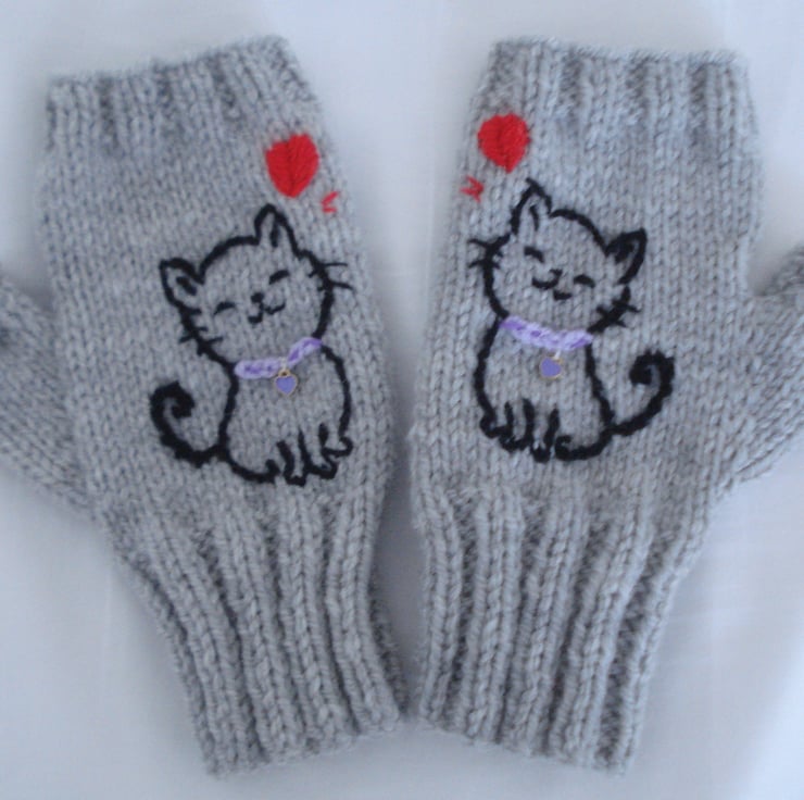 This is a pair of hand knitted silver grey gloves on which I have embroidered a black cat. The cat has a pale purple collar with a little purple plastic heart attached. There is also an embroidered red heart above the cat. These would fit a small to medium hand and are 19 cm long.