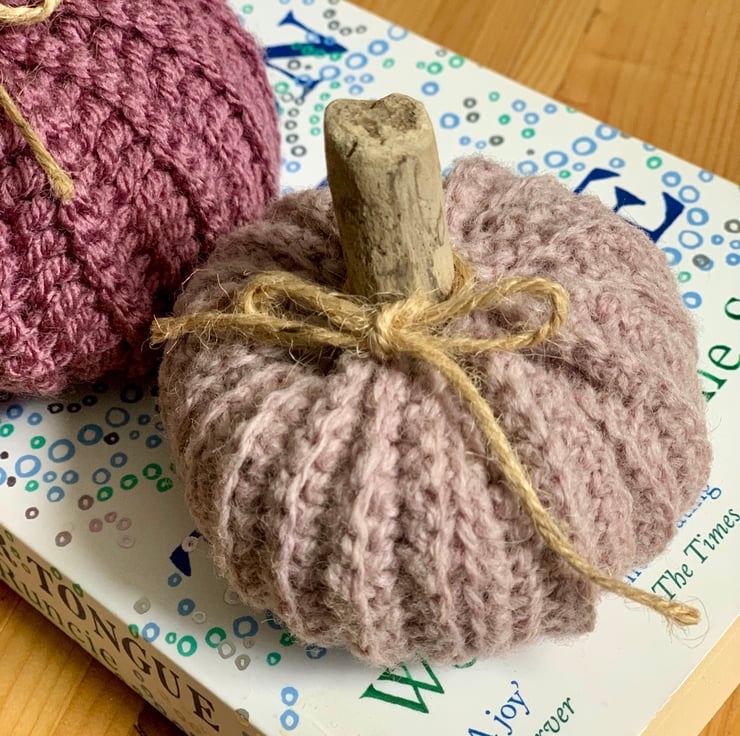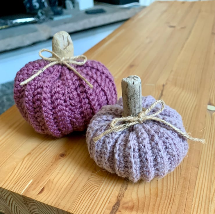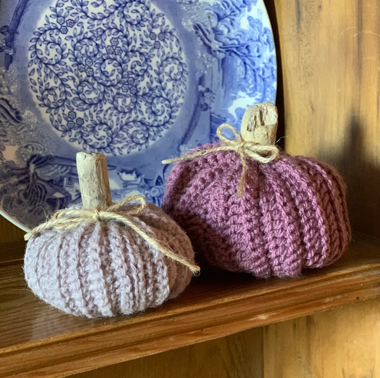 The larger pumpkin is handmade using acrylic yarn and the smaller using British wool. Both are stuffed with wool fibre and finished with a driftwood stem and a twine bow.