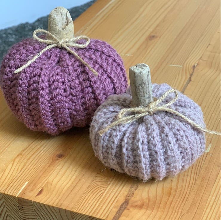Set of two pink handmade crochet pumpkins. Two pumpkins in autumnal pinks. Look great to add cosiness to a shelf, hearth of as a table decoration.
